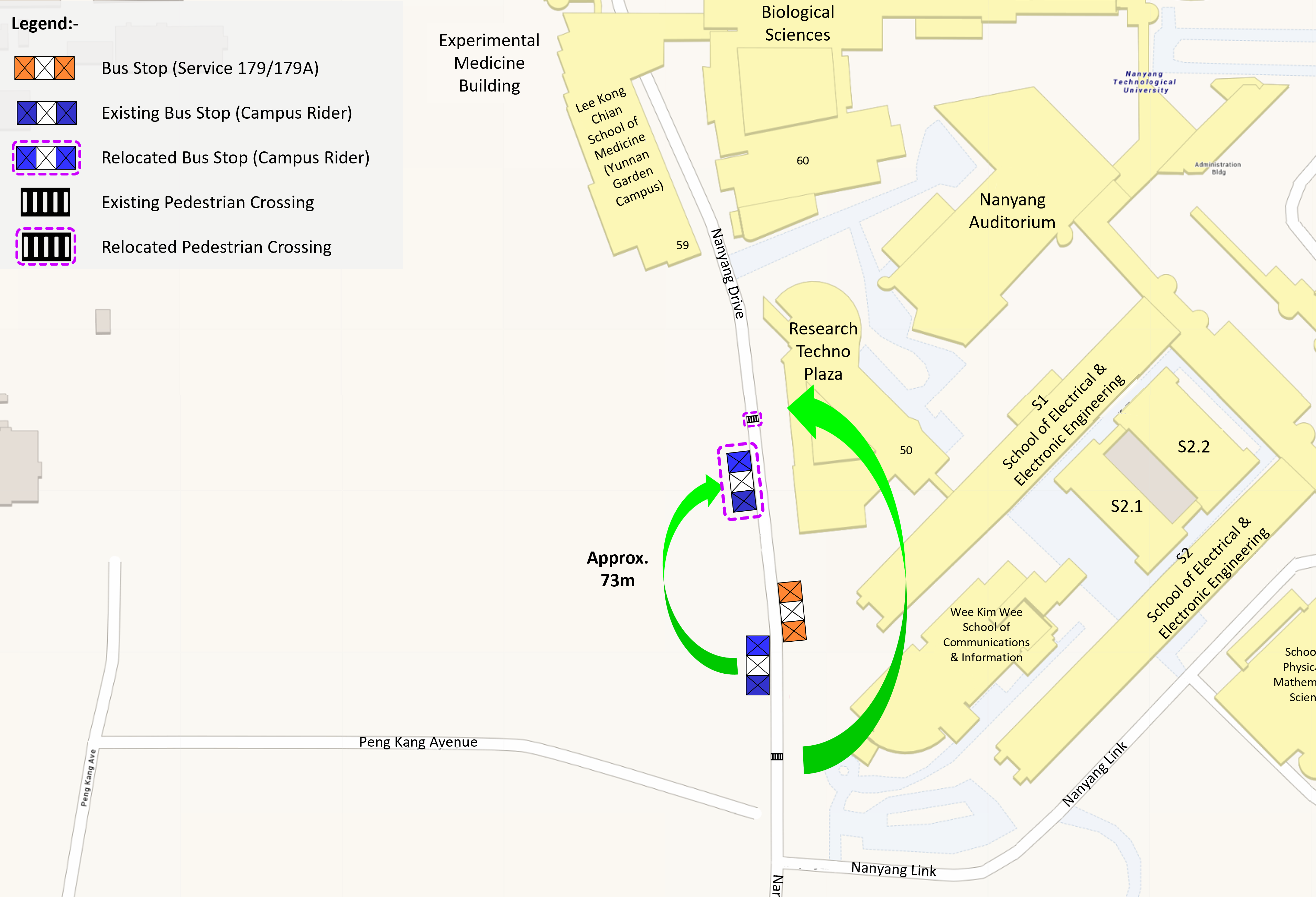 Two existing bus stops (North Spine side) and one bus stop (NIE side) on Nanyang Drive will be shifted to new temporary locations, as shown in the diagram below. The relocation does not affect the existing SBS and campus shuttle bus routes and timings.