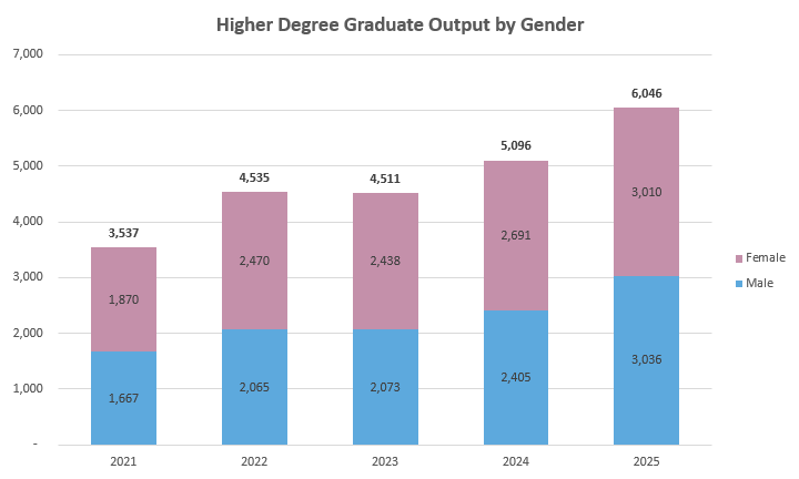 Graduate Output - First Degree & Higher Degree 20212022 2023 2024 2025 Click on the respective year for detailed statistics of the first degree graduate output by gender. 20212022 2023 2024 2025 Click on the respective year for detailed statistics of the higher degree graduate output by gender.