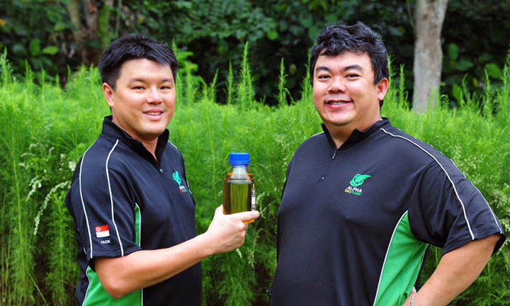 Allan (right) with fellow co-founder and Chief Operations Officer of Alpha Biofuels, Jack Ling, posing with a bottle of Singapore’s first biodiesel. (Photo: Alpha Biofuels)