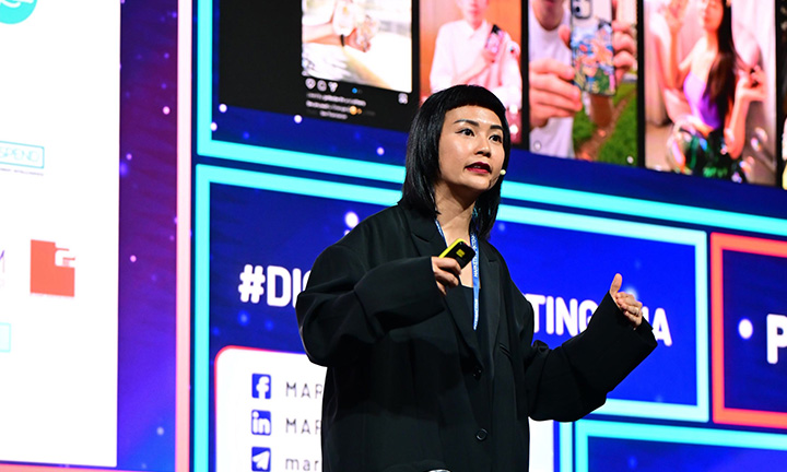 Evangeline speaking at the Digital Marketing Asia 2025 conference in 2025 on trends in influencer marketing.
