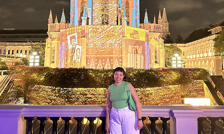 In her light projection debut at the Singapore Night Festival, visual communication alumna Hafizah Jainal brought her grandparents’ migration story to life on the façade of CHIJMES.