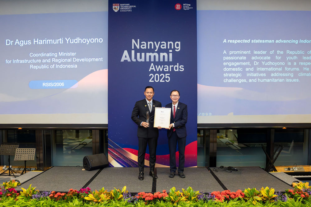 The evening’s pinnacle was the conferment of NTU’s highest accolade – the Nanyang Distinguished Alumni Award, upon Dr Agus Harimurti Yudhoyono (RSIS/2006), Indonesia’s Coordinating Minister for Infrastructure and Regional Development, in recognition of his exemplary leadership and steadfast dedication to public service.