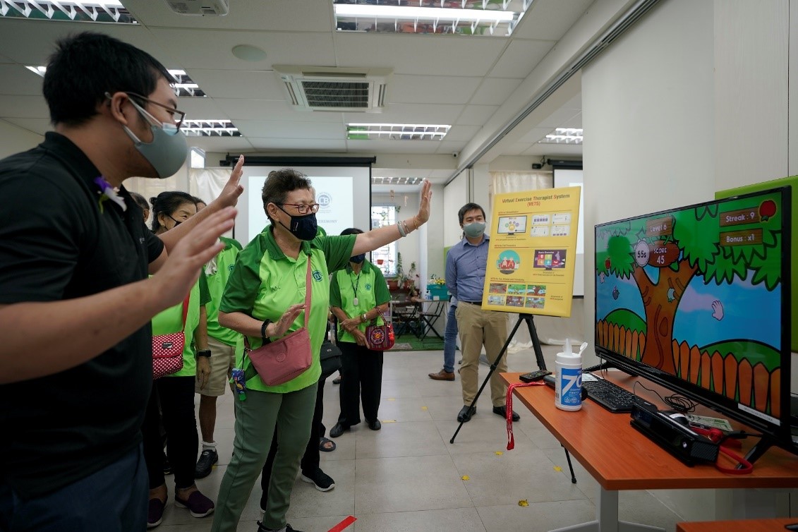 Photo 2: Seniors from Lions Befrienders try out the Virtual Exercise Therapist System (VETS), a highly customised and personalised interactive gaming rehabilitation exercise system that allows for physical activity monitoring with fitness analytics (range of motion, energy expenditure, steps, etc.). The use of technology, such as games that train seniors’ cognitive skills and exercises that build their physical strength, is a key research area under this partnership.