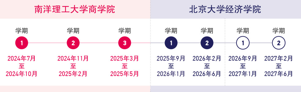 学生分阶段在两校完成各自培养方案认可的课程,符合双方毕业要求的学生将获得南洋理工大学金融硕士学位和北京大学专业硕士学位。