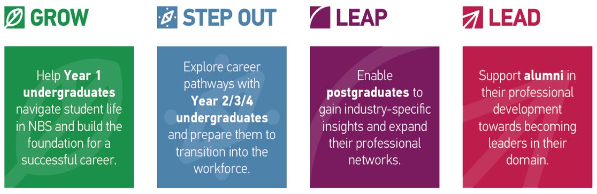NBS organises four alumni mentoring programmes: Grow, Step Out, Leap, and Lead. Each is aimed at supporting NBS students and alumni at different stages of their learning and career journeys. More information about the respective programmes can be found here.