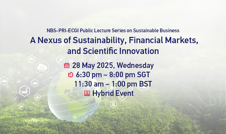 The NBS-PRI-ECGI Public Lecture Series is a new global joint initiative between Nanyang Business School (NBS), the United Nations-supported Principles for Responsible Investment (PRI) and European Corporate Governance Institute (ECGI) to facilitate the knowledge exchanges between academics, practitioners, and policymakers in sustainable business.