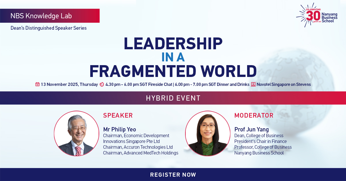 The session will be moderated by Professor Jun Yang, Dean of Nanyang Business School, and followed by an audience Q&A.