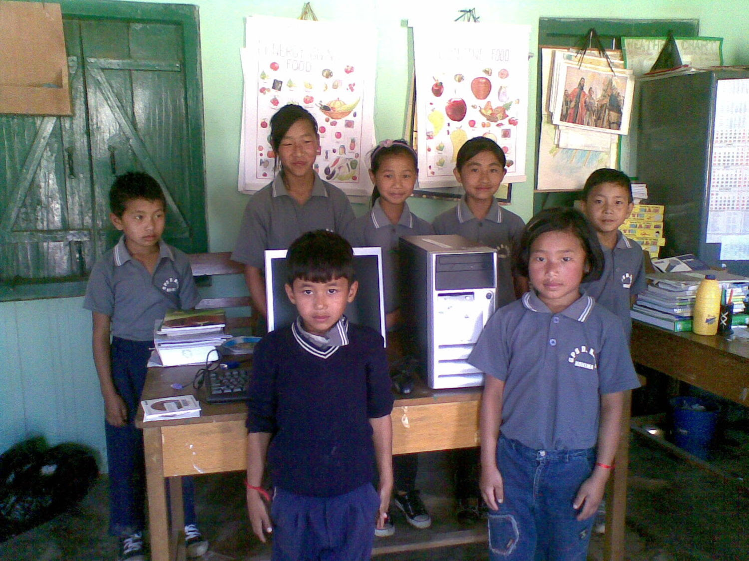 Children from a rural school receive refurbished computers as part of the foundation’s mission to improve the education system in Kohima