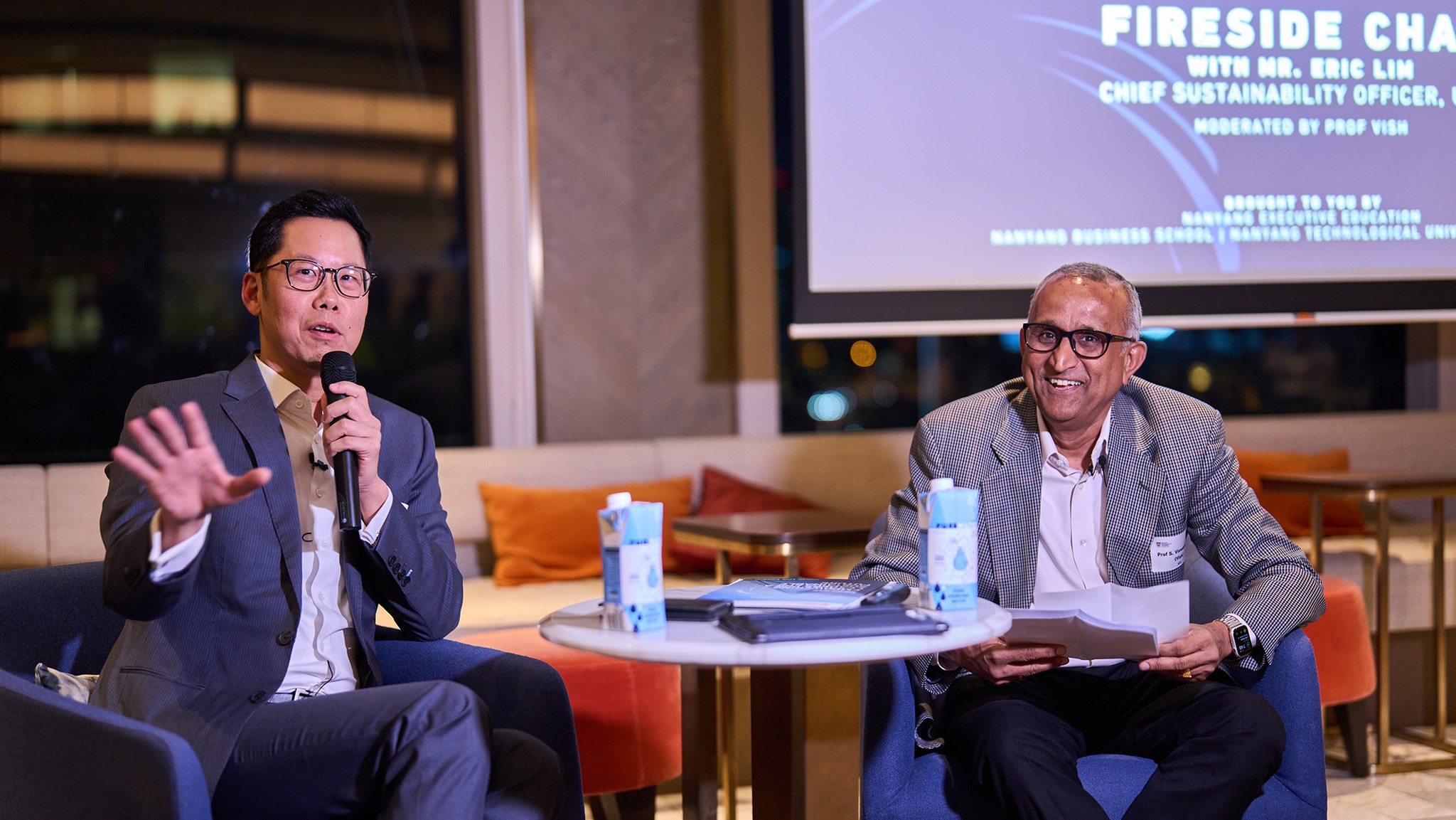 Eric Lim, Chief Sustainability Officer (CSO) at UOB and an alumnus of Nanyang Business School (left) speaking at the NBS “Sustainability Leadership: Navigating the Challenges and Opportunities” event on 21 February, moderated by NBS Prof. S. Viswanathan (right)