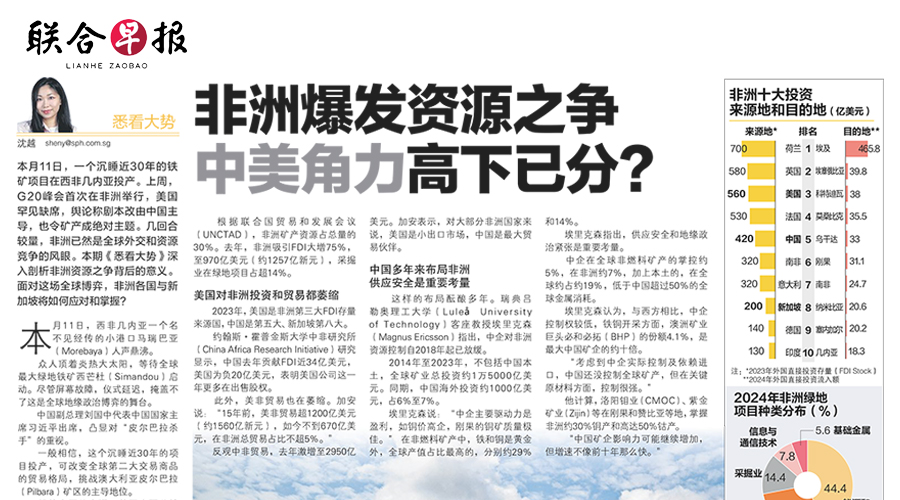 Chinese language daily Lianhe Zaobao carries a warning by Centre Director Amit Jain over great power competition for African resources.