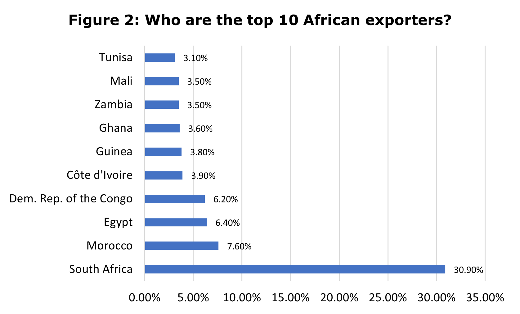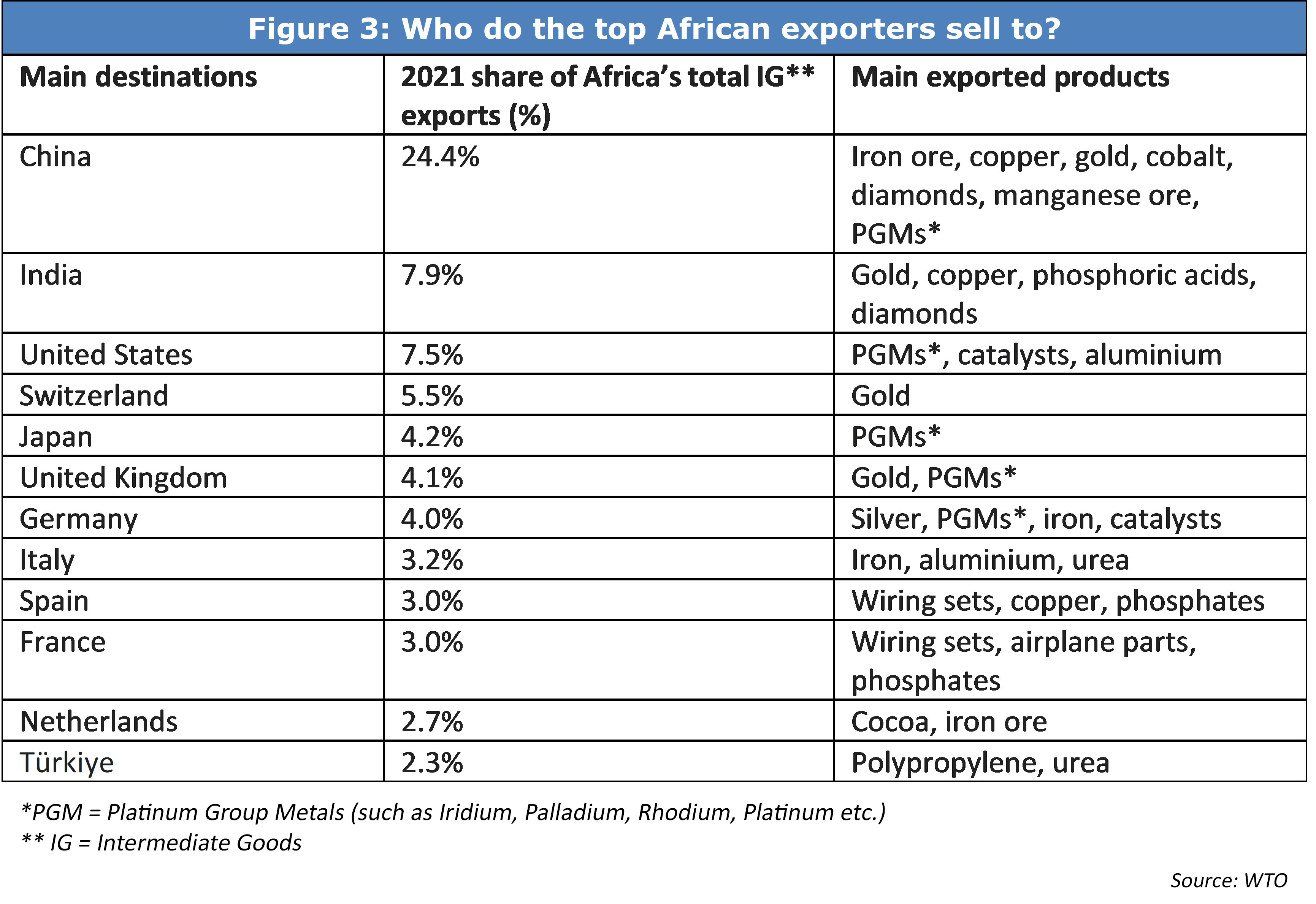 According to the WTO in 2021, Africa’s exports of intermediate goods (IG) represented three-quarters of total merchandise exports from the continent and were worth US$265 billion. These exports mostly comprised primary commodities in raw or semi-processed form, destined for global production chains. South Africa is by far the biggest exporter of intermediate goods, with a share of 30.9% in 2021 (US$81.9 billion).