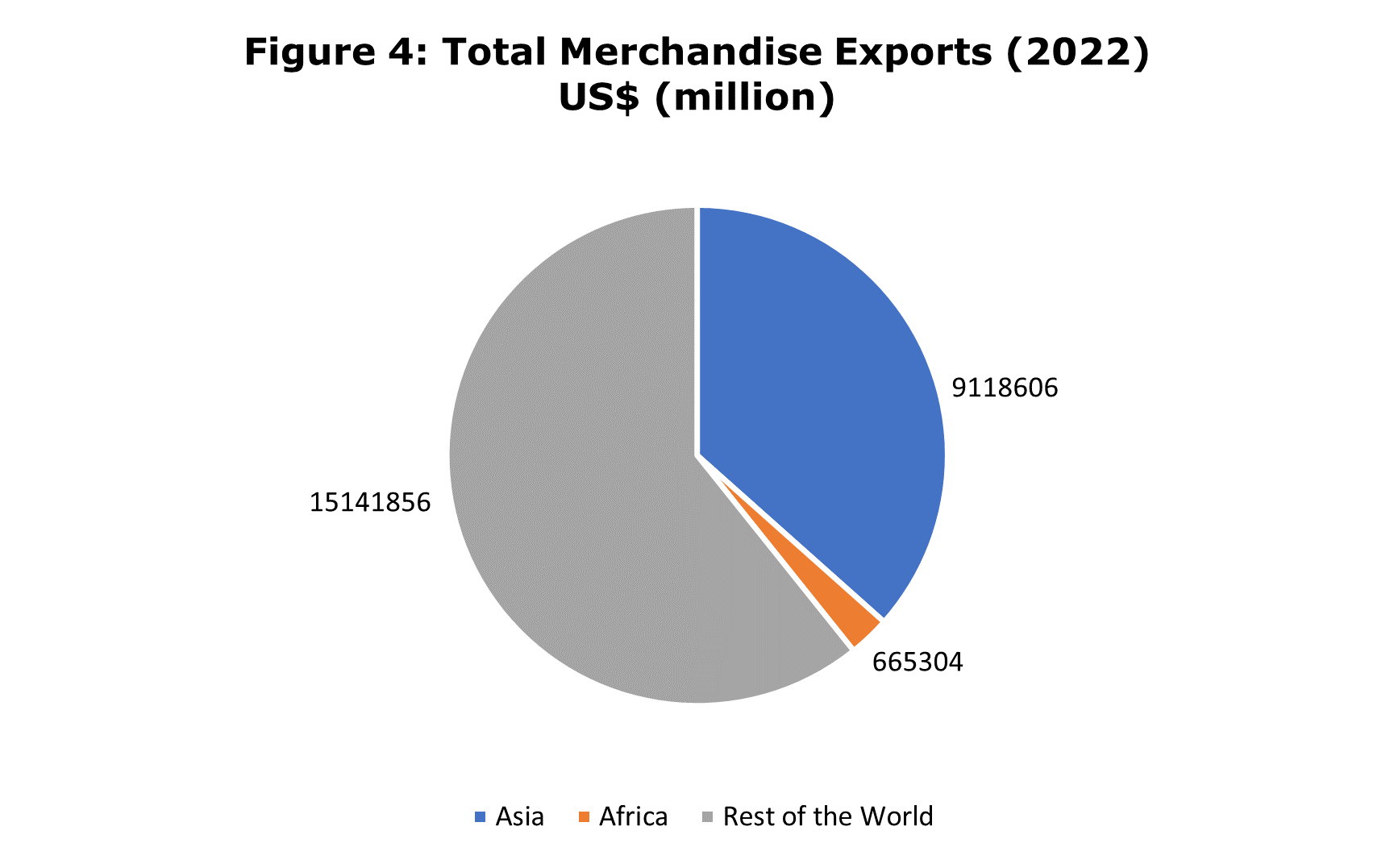 Unlike Asia, globalisation for Africa has been synonymous with exploitation. Despite reduced trade barriers, a more conducive environment for inward investments, and the integration of financial markets, Africa has, for the most part, failed to capture the gains of globalisation in the way its former peers in Asia have managed. Since the 1980s, technological advances have dramatically reduced logistics and communication costs, enabling the unbundling of the manufacturing process. This made it possible for manufacturers to outsource some stages of production to lower-cost jurisdictions. While East and Southeast Asia moved swiftly to take advantage and climb the global value chain ladder, Africa did not. Today, Africa accounts for just 2.6% of global exports, mostly consisting of primary commodities and natural resources. [5]