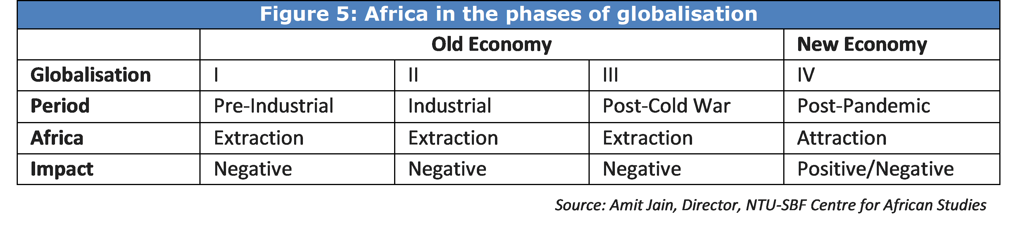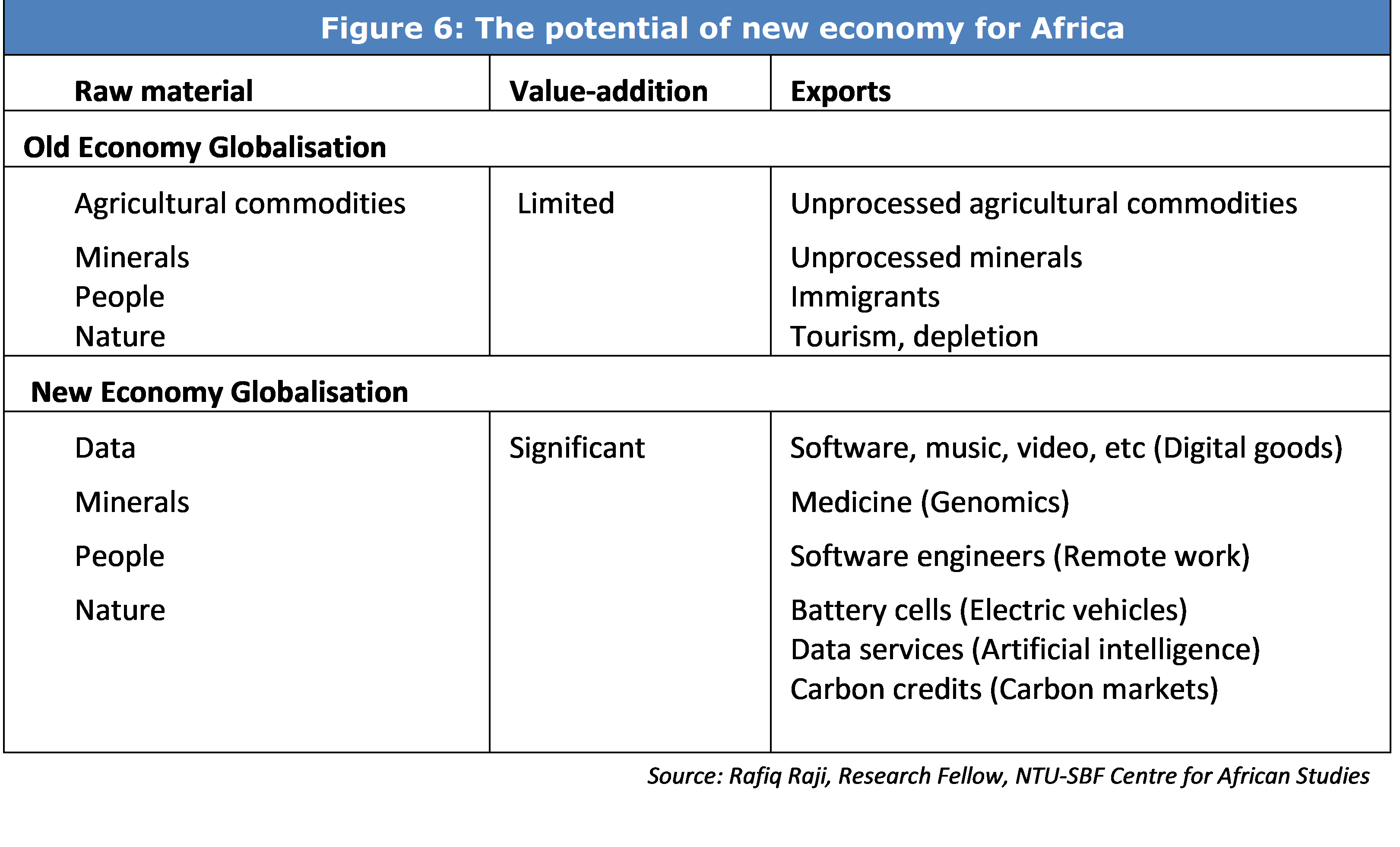 From an African perspective, we observe two eras of globalisation - An old economy globalisation in which Africa was, at best, a bystander and, at worst, a source of extraction. Then there is the new economy globalisation in which Africa need not merely be a supplier of critical natural resources but also be an active intermediary in the manufacture of finished goods and provider of services. However, to capture value out of this new economy Africa would need to engage in collective bargain, invest in human capital and position itself well as a single market to attract draw investments not merely into resource extraction but also in manufacturing. The new economy, by definition, involves “activities based on knowledge and information, rather than traditional industries such as manufacturing.”[6] Unlike the old globalisation, which largely de-industrialised African countries,[7] this new era of globalisation, centred around the new economy industries, could be a catalyst for the re-industrialisation of Africa – provided that governments are proactive and assertive in their interventions.[8]