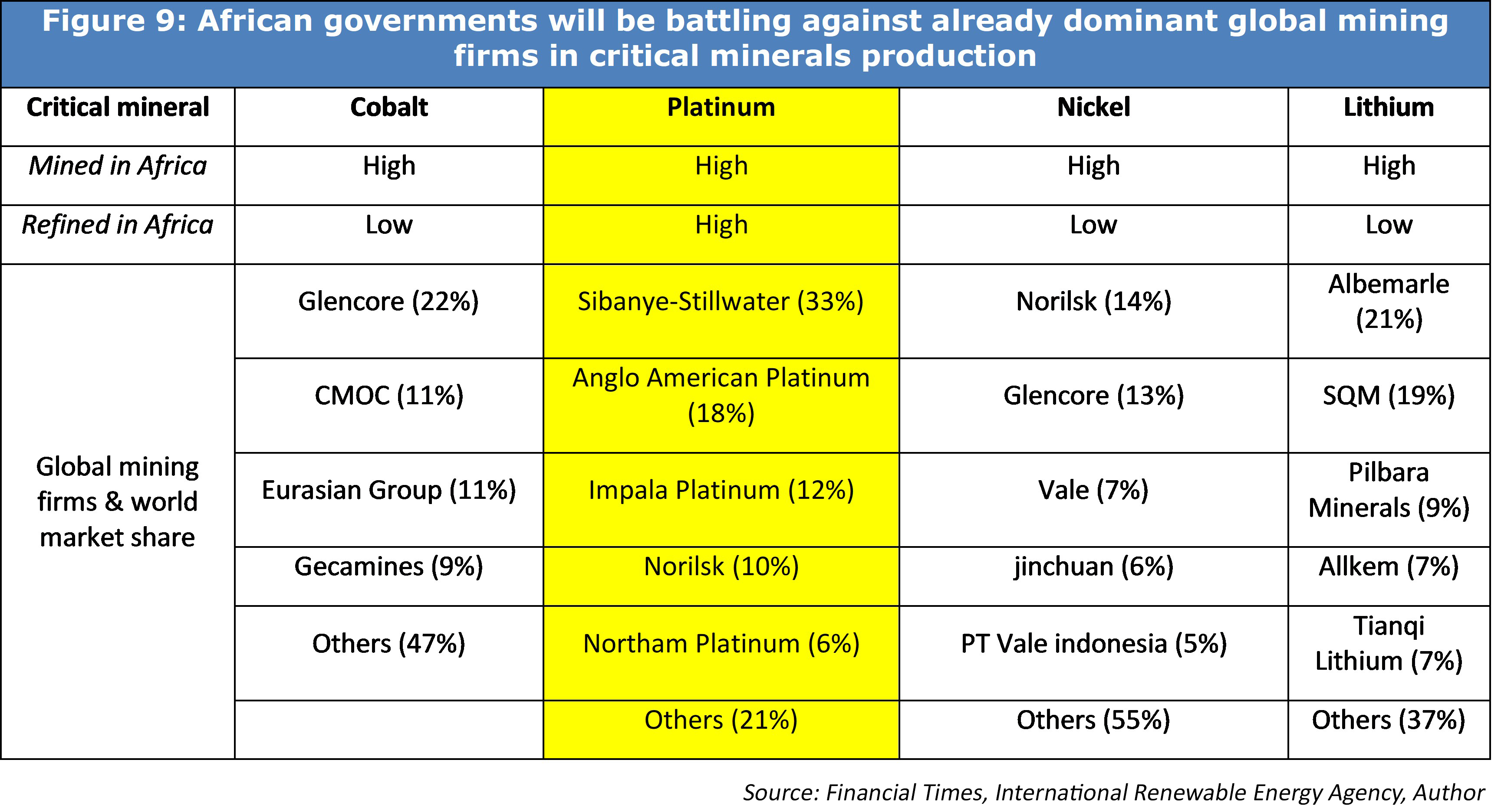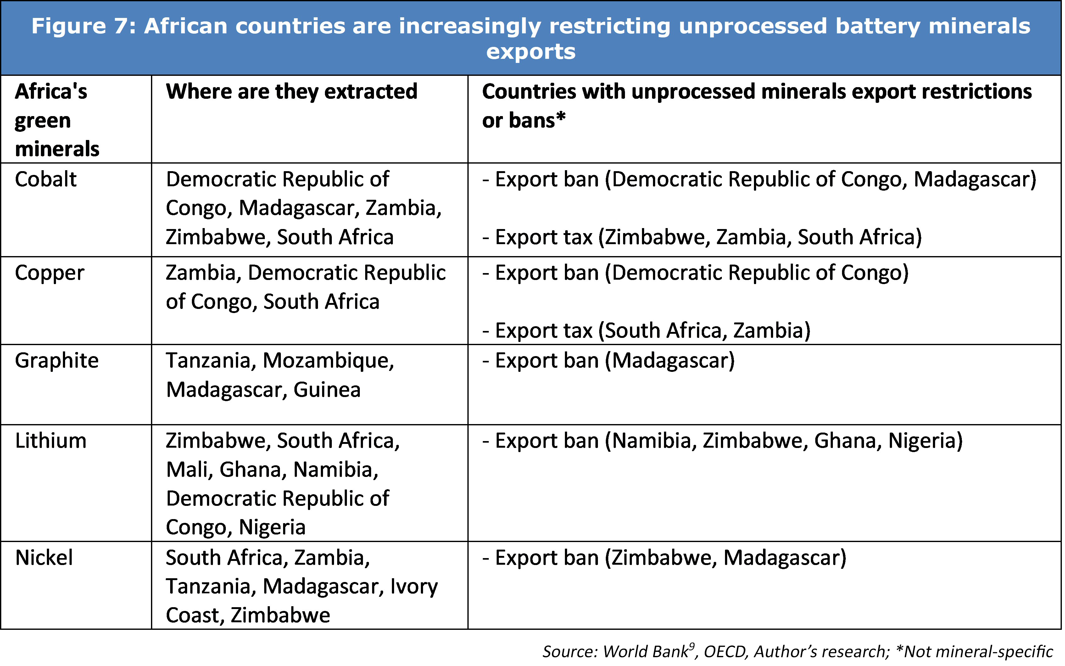 Some African governments have started to introduce export bans on raw mineral exports to compel mining firms to invest in mineral processing. But such steps have so far yielded limited results. That is because processing minerals remains a highly skilled and capital-intensive exercise. The processing that is taking place is therefore early stage at the low end of the scale – like producing condensates. China retains a commanding lead on the capacity to process minerals at scale. For critical minerals like cobalt, where the DRC is the main global supplier, or Zimbabwe, which has substantial lithium reserves, strong interventionist policies such as export bans could be effective. For other battery minerals where, African countries are just marginal players, such industrial policies may not be effective.