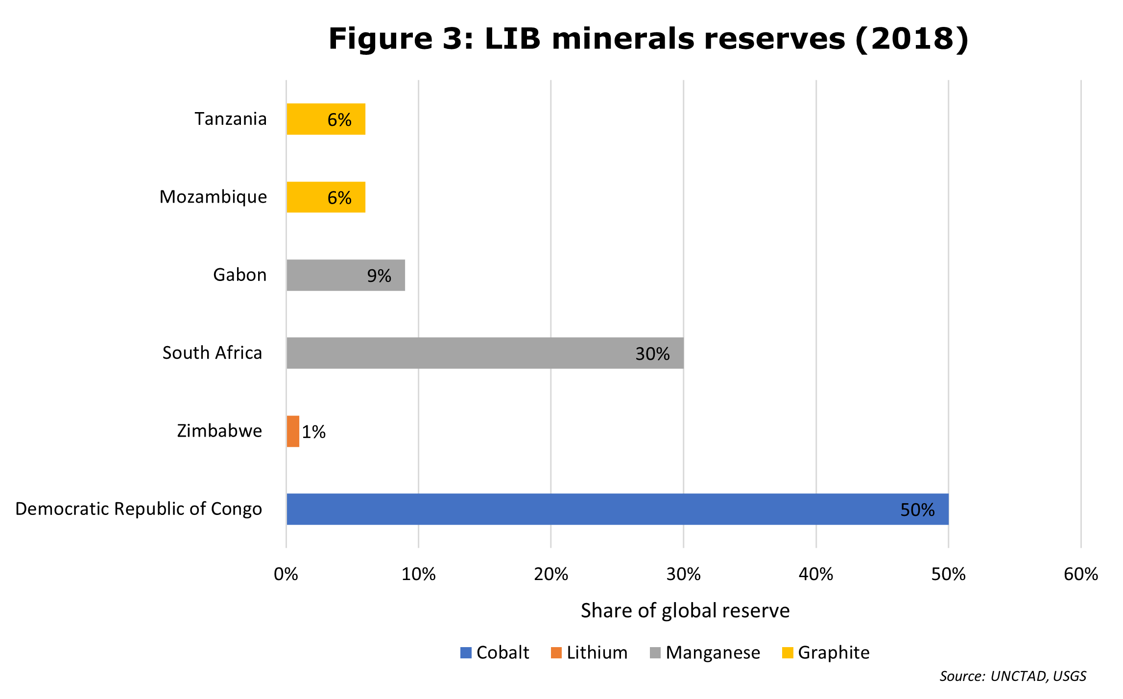The key minerals that constitute a lithium-ion battery are lithium, cobalt, manganese, and natural graphite of which African countries hold a significant share of the global reserve (Figure 3).