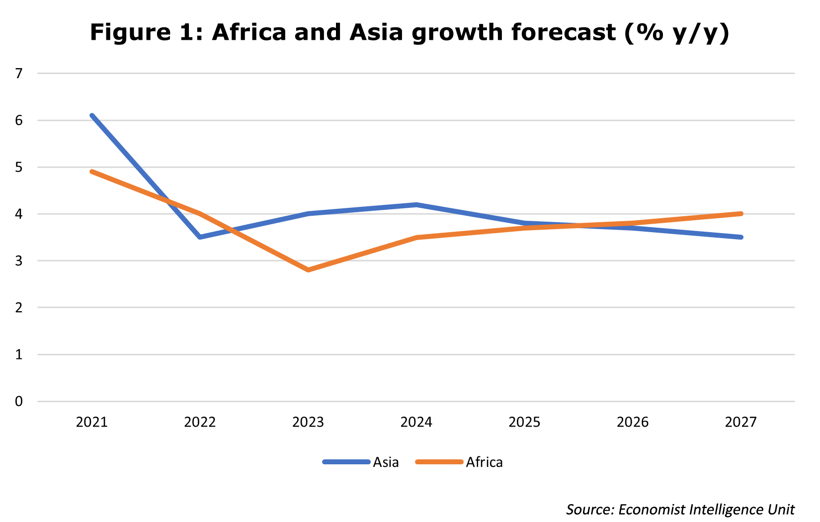 70% of global FDI is going to emerging markets. But FDI to Asia is 15 times the size of African inflows (figure 3). The forecasted African growth outlook is also less persuasive over the short-term, although it is predicted to bottom out in 2023 and eventually surpass Asian growth rates from 2025.