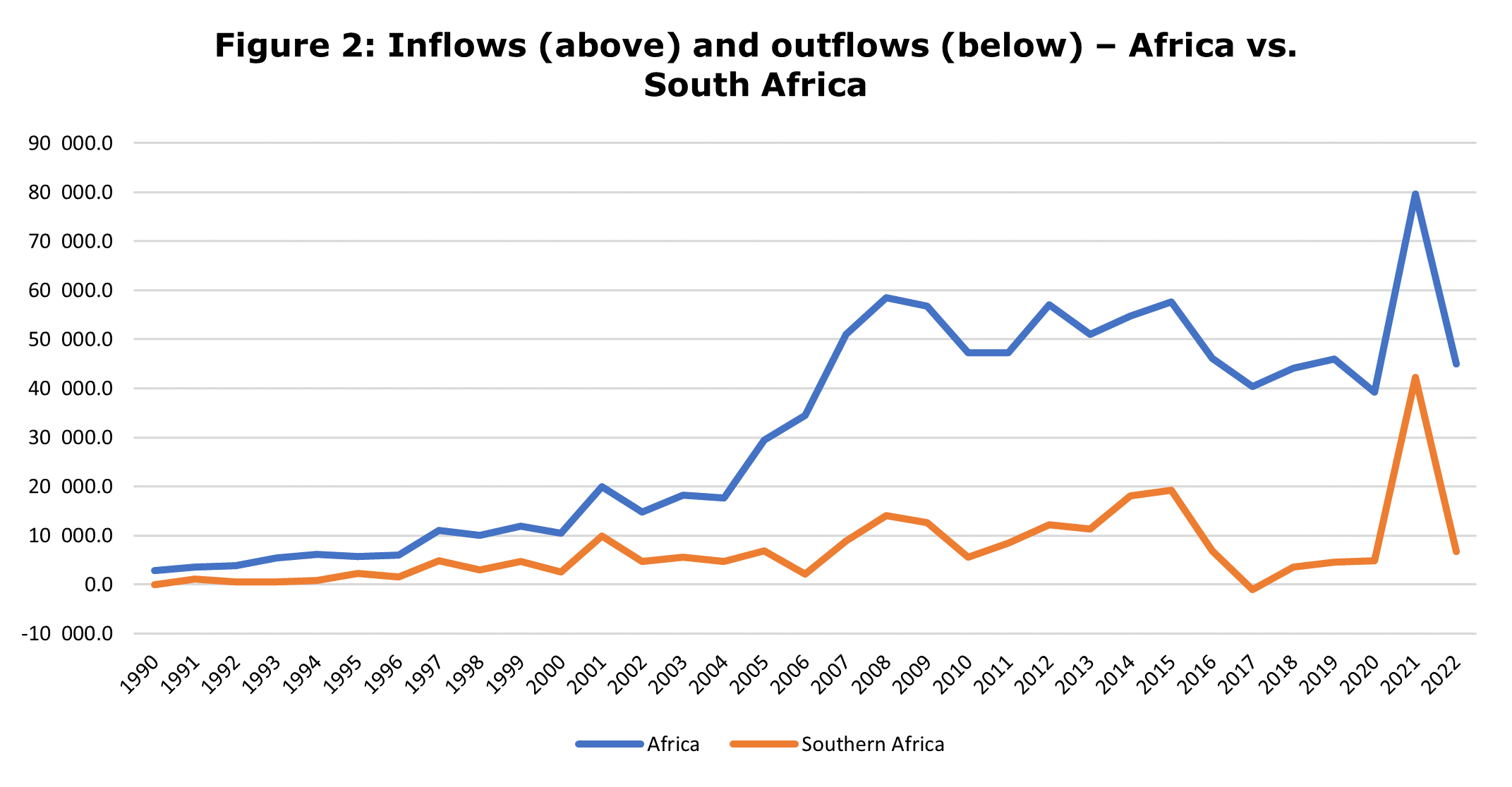 The fall Africa experienced in foreign direct investment in 2022 is in large part, due to the corporate structural reconfiguration of South African technology and communications company, Prosus / Naspers[2] the prior year. The transaction, which saw various companies in the group spun out and listed under Prosus in the Netherlands resulted in a sharp inflow of funds into South Africa, after which much was repatriated (outflows) to the newly listed entity. The US$42bn deal[3] was bigger than the total investment into the rest of the continent that year (2021) and nearly 10 times what South Africa receives on average annually.