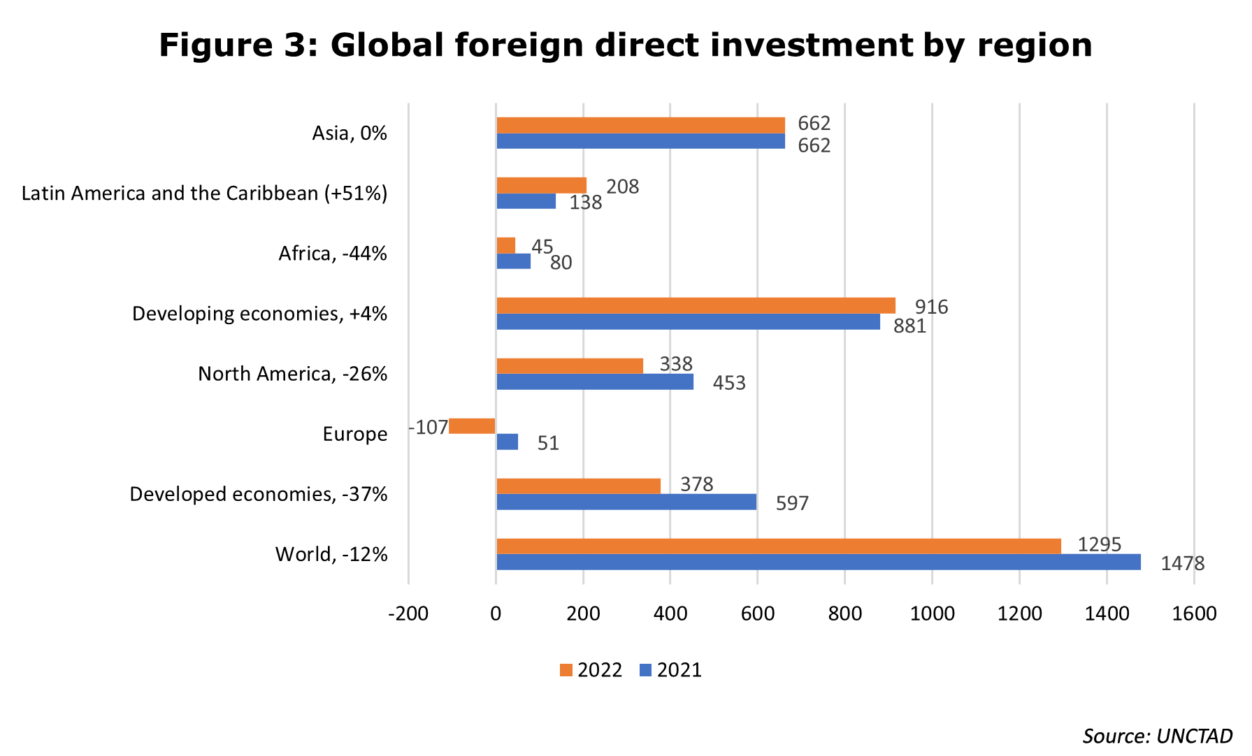 The United Nations Conference on Trade and Development’s (UNCTAD) 2023 World Investment report (WIR) shows that foreign direct investment (FDI) into Africa fell 44% to US$45bn in 2022 from the record US$80bn in 2021. At face value, it is a very concerning trend reversal. The reality, however, is more nuanced and there are important reasons not to be too pessimistic about the headline figure. Stripping out a one-off event that inflated the FDI growth figure for Africa in 2021, African FDI still grew at 7% year-on-year, certainly more modest but still ahead of continental growth.