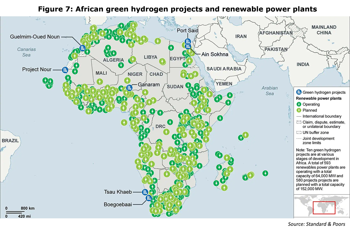 The total green hydrogen potential in Africa is estimated to be 50m tonnes annually by 2035. Standard and Poor estimates show that there are at least ten green hydrogen power projects in various stages of development all across Africa.