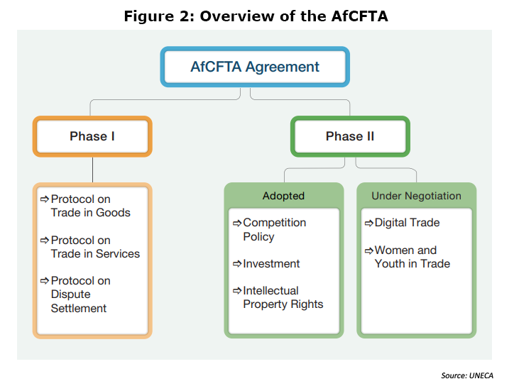 Yet trade between member states under the AfCFTA has barely got off the ground. The agreement is still far from achieving its full potential. The AfCFTA Secretariat in Accra has been focused on supporting signatories to implement the agreement while simultaneously finalising aspects of the first two phases of the agreement. The negotiations for the AfCTA have been conducted in two phases (Figure 2 below). Phase I of the agreement pertains to the liberalisation of trade in goods and services and dispute settlement. Phase II covers five protocols on Investment, Intellectual Property Rights, Competition, E-commerce and Women and Youth. These protocols and the framework agreement constitute the legal instruments of the AfCFTA. State Parties have adopted Phase I protocols but negotiations to finalise certain aspects of the agreement such as rules of origin and tariff schedules continues. Under Phase II they have adopted some of the instruments including Intellectual Property, Competition and Investment Protocols. Currently, negotiations for the Protocol on E-Commerce and Women and Youth are well underway.