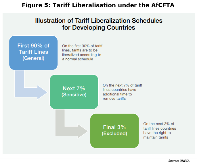 The E-Tariff Book sets out the tariff commitments for AfCFTA with approved and officially published tariff schedules. Under the AfCFTA, State Parties have committed to eliminating tariffs on 97% of tariff lines over an agreed period, while excluding a maximum of 3 percent of total tariff lines from liberalization. 90% of the 97% of goods will have tariffs removed over the course of five years in developing countries and ten years in the least developed countries (LDCs). While the remaining 7% of tariff lines fall under sensitive products. These will be reduced and eliminated over an extended timeframe. For developing countries, elimination will occur over 10 years, while the LDCs will eliminate tariffs over 13 years. To illustrate this, if you are a producer in one African country and want to export your goods to another, then you can expect tariffs to come down steadily. For example, a product in the 90% category imported by a developing African country in 2020 and charged a 30% duty would only be charged a 25% duty in 2021, a 20% duty in 2022 until the tariff is zero in 2026. This will help companies clarify and keep track of the changes in trade at the international and regional levels.[10] In real terms, this means that firms will be aware of the possible export opportunities but also the tariffs of potential export destinations under the AfCFTA, as well as the implications for competition from imports.