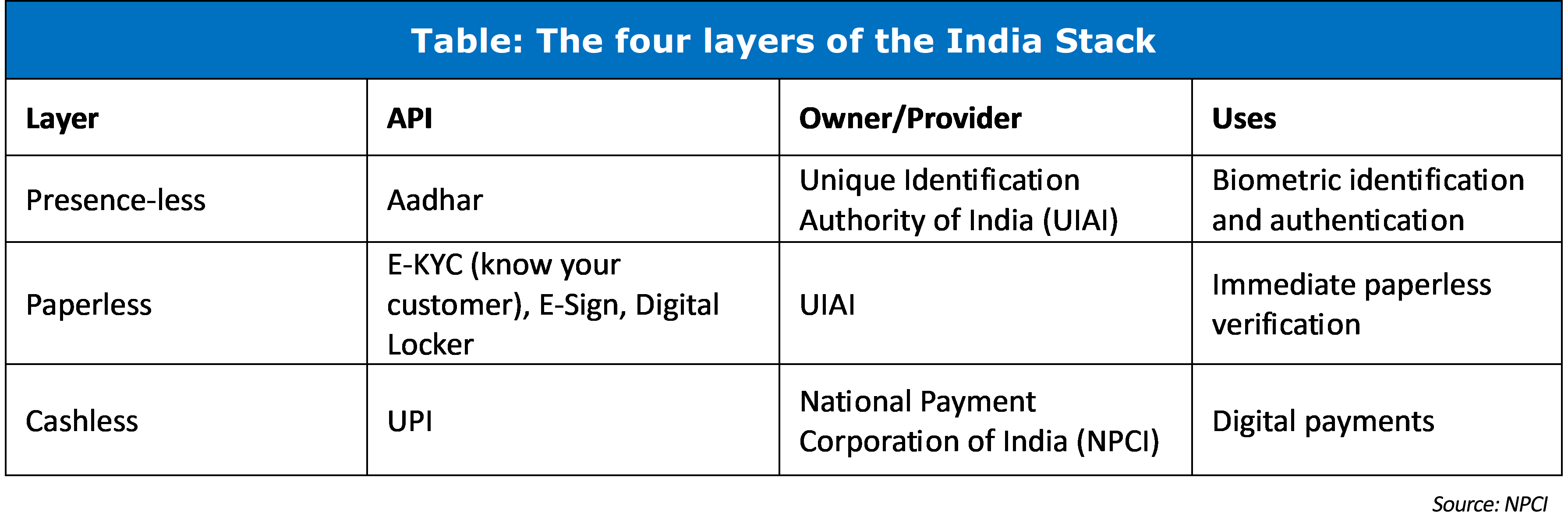 The presence-less layer – which is the foundation of the stack – is anchored on the Aadhaar biometric digital identity system. Established in 2010 by the Unique Identification Authority of India (UIAI), Aadhaar provides individuals with a unique 12-digit identification number backed by biometric details.[4] It allows them to make digital cash transactions, access public service, receive social benefits or engage with government agencies without necessarily being physically ‘present’. As many as 1.4 billion Indians are enrolled under Aadhaar, according to the UIAI, suggesting near universal coverage.[5]