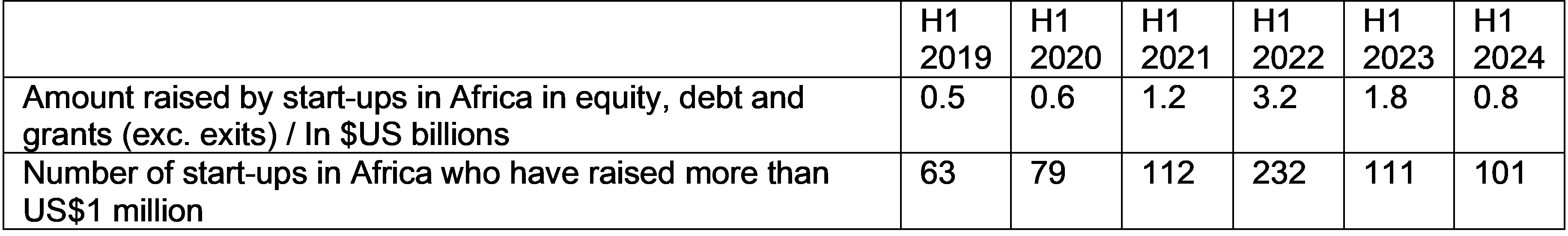 It has been another difficult period for start-up investments in Africa. They raised just over US$300 million in Q2 2024 in equity, debt and grants (exc. exits) - the lowest quarterly performance since late 2020. Combined, start-up investments on the continent have reached $780 million in H1 2024, much lower than in previous periods: US$1.8b in H1 2023, US$3.2b in H1 2022 and US$1.2b in H1 2021. More encouragingly, there have been 1011 ventures who raised at least US1 million in the first half of the year on the continent, a number pretty much comparable to H1 2023 and H1 2021 levels (111 and 112 respectively), though considerably lower than at the height of the heatwave in H1 2022 (232).