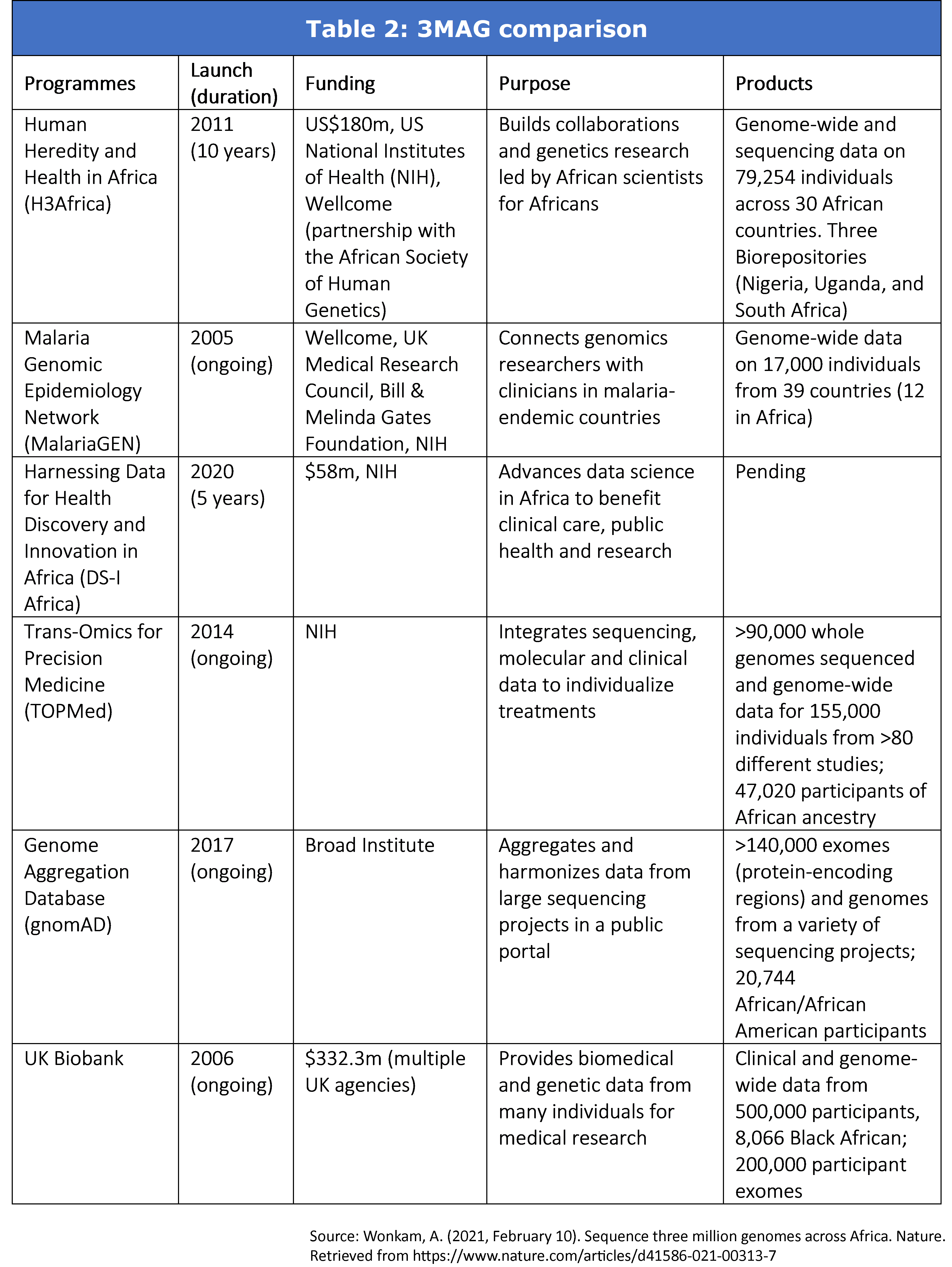 A database of the genetic information of the African population will be invaluable. The Three Million African Genomes (3MAG) project is a major step in this direction but would cost US$450m a year and would take 10 years to complete, according to Ambroise Wonkam, a professor of medical genetics and one of the champions of the endeavour.[18] The Covid-19 pandemic brought to fore the importance of knowhow and resources on the African genome. According to the World Health Organisation (WHO) genomic sequencing was crucial to rapidly identifying the coronavirus and developing a robust response towards containing it. Africa’s shortcoming in this regard has been writ large, with the continent accounting for “just 1% of the more than 3.5m Covid-19 sequences carried out to date worldwide.”[19] The Africa Centre for Disease Control Institute of Pathogen Genomics, US CDC, Bill & Melinda Gates Foundation, Microsoft, Illumina (a genomics sequencing technology firm), and Oxford Nanopore Technologies are collaborating on a US$100m 4-year initiative to “integrate pathogen genomics and bioinformatics into public health surveillance, outbreak investigations, and improved disease control and prevention in Africa.”[20]