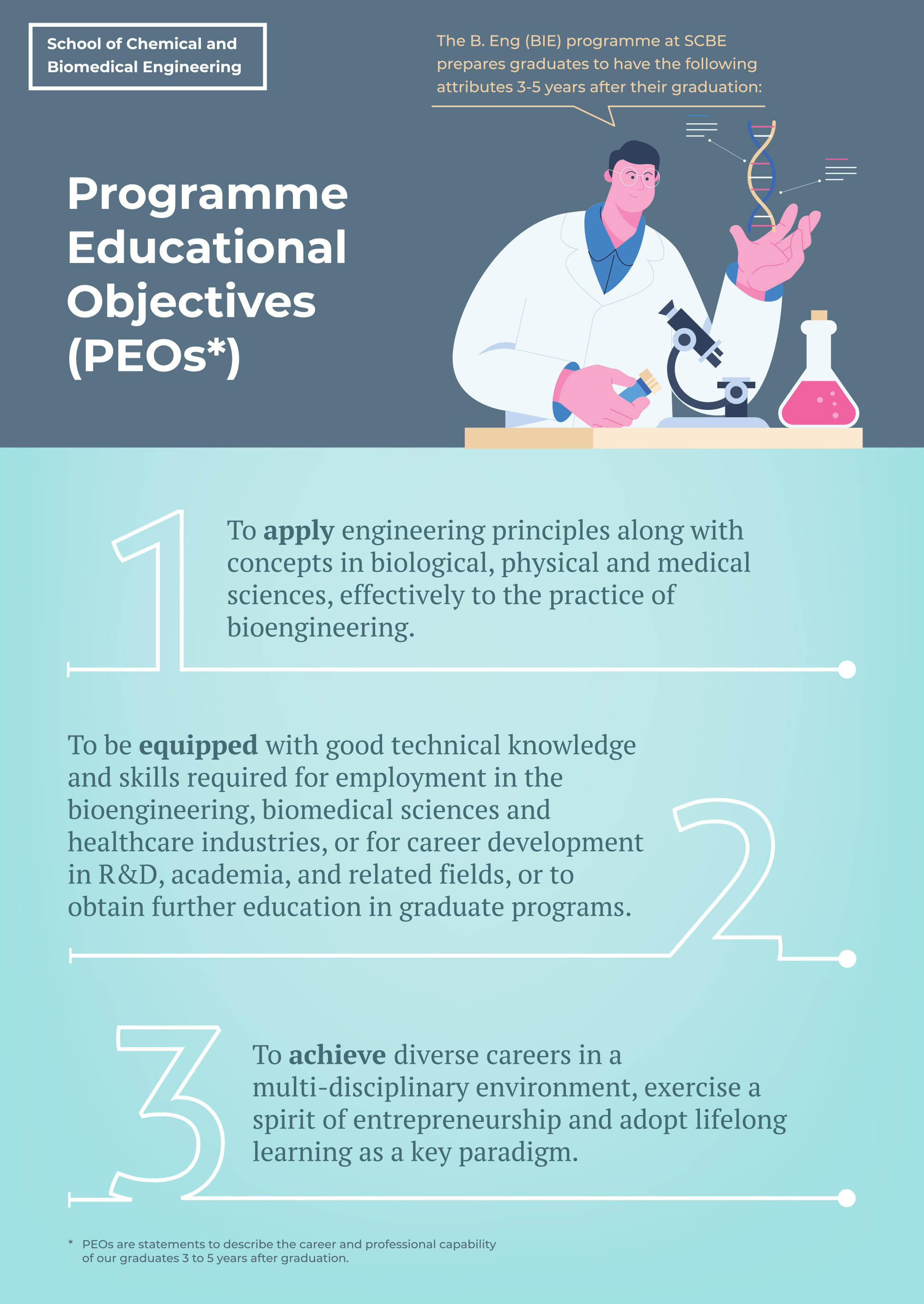 To fulfil the mission and to realize the vision of the University and the School, CCEB’s Bioengineering (BIE) Programme is formulated to produce graduates who have the following attributes 3-5 years after their graduation: