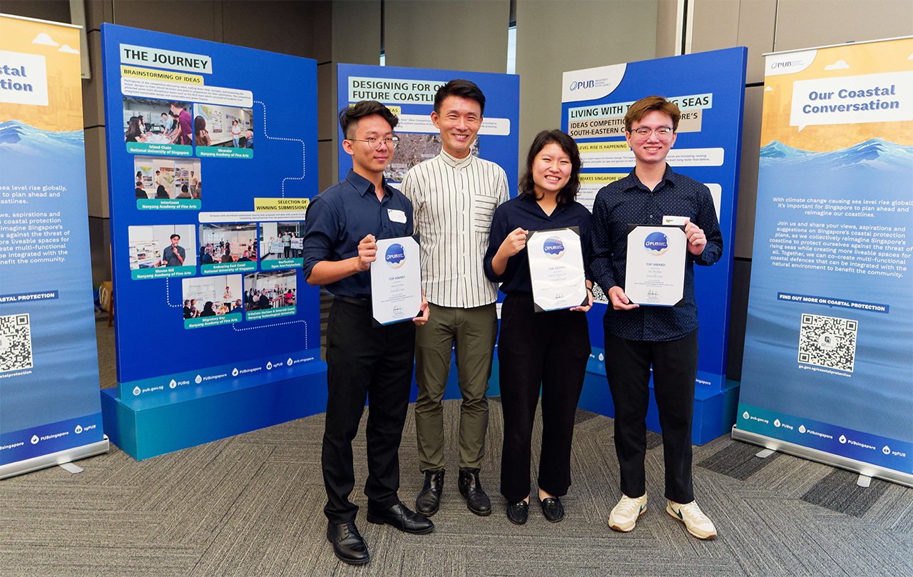 At the "Living with the Rising Seas" Idea Competition by Public Utilities Board (PUB), our undergraduate students Yeong Yoong Sze (ENE/Y4), Tan Zhi Xian (ENE/Y3), Yew Jun Hao (ENSU/Y3) and Chai Jin Xie (CEE/Y3) won two entries in Typology B – Nature Centred Coastline and Typology C – Recreational Seafront.