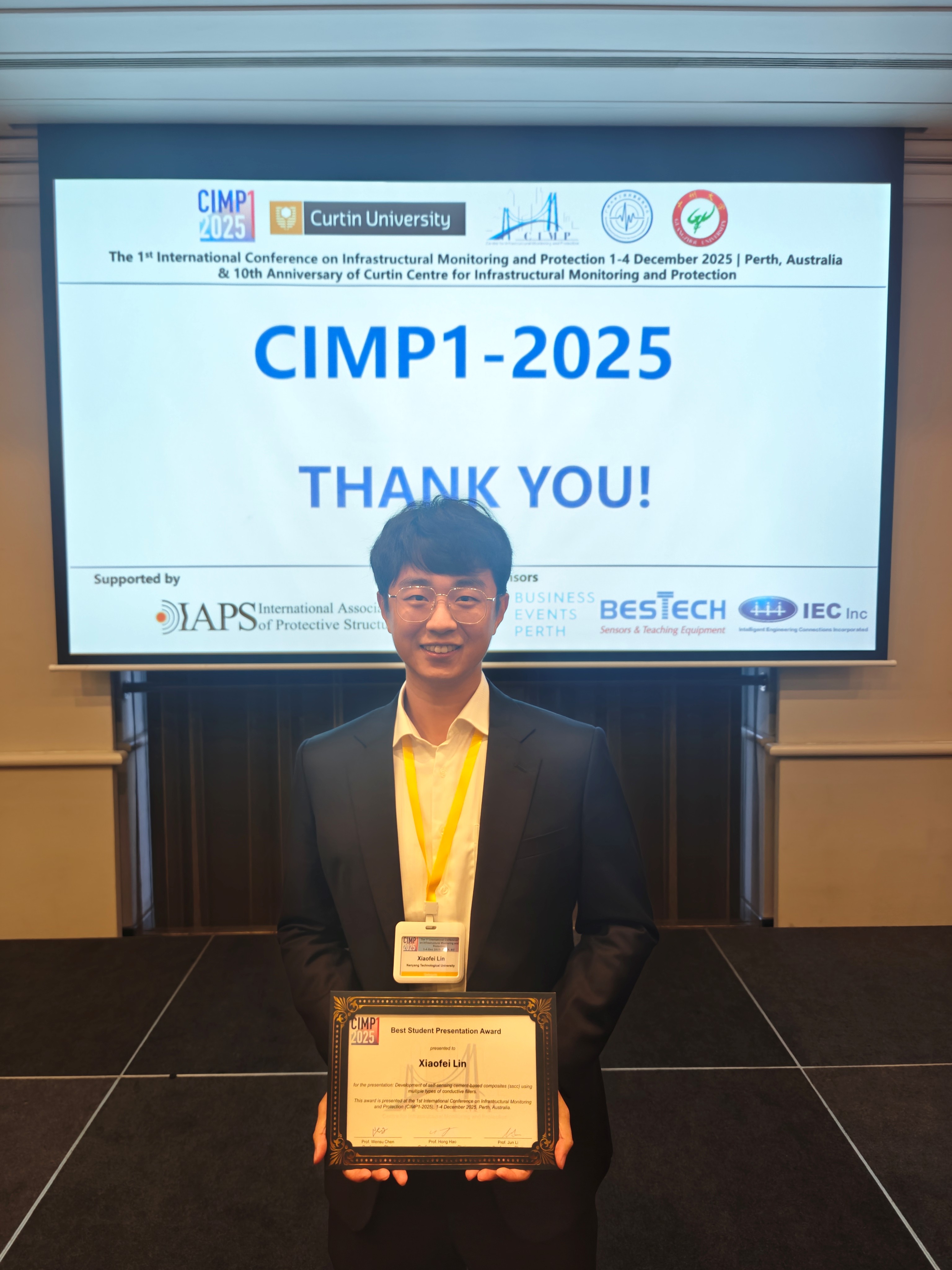 Congratulations to our PhD student, Lin Xiaofei, for receiving the Best Student Presentation Award at the 1st International Conference on Infrastructural Monitoring and Protection (CIMP1-2025).