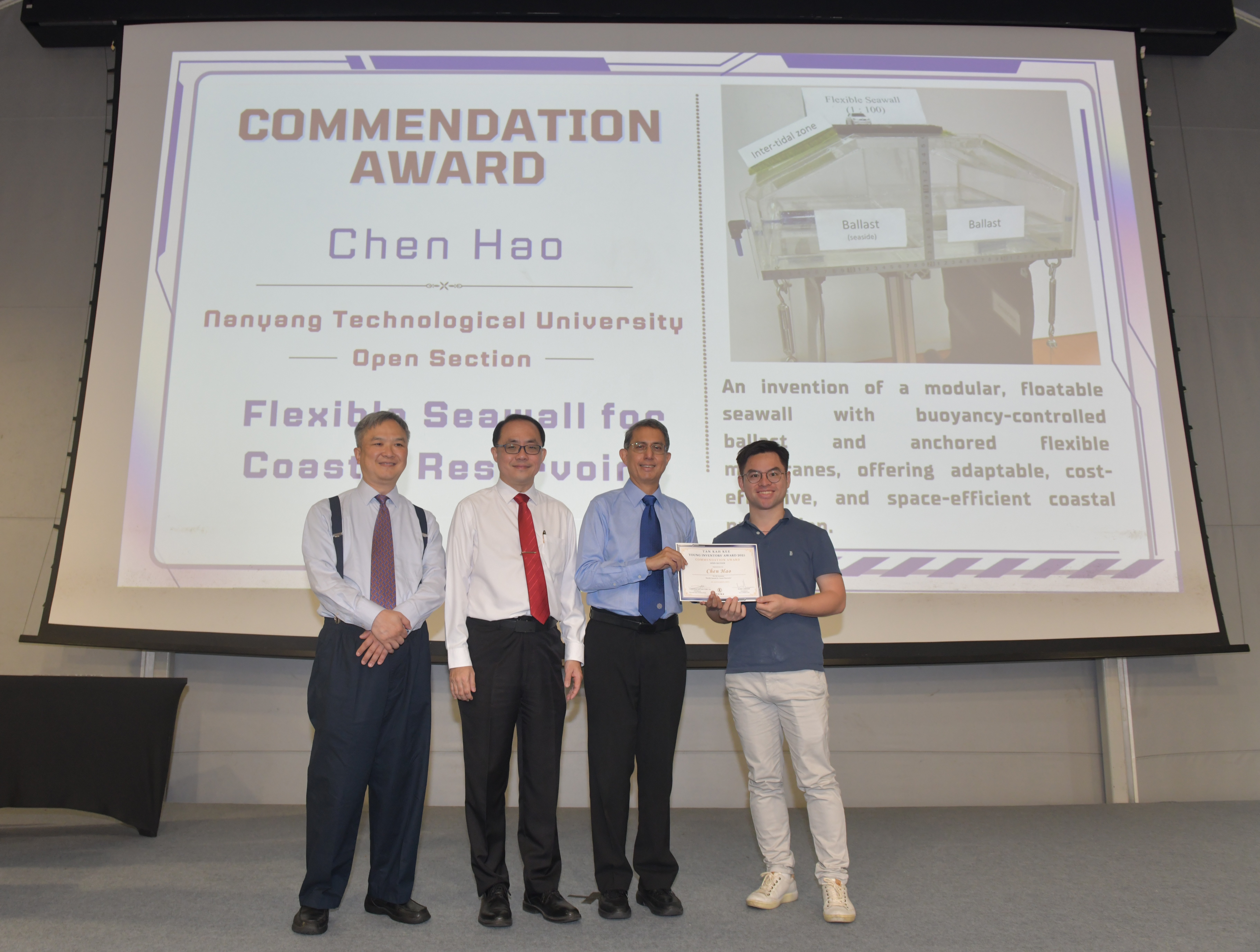 The School is proud to announce that Dr Chen Hao, Research Fellow of NTU School of Civil and Environmental Engineering, has received the Tan Kah Kee Young Inventors’ Commendation Award 2025 (Open Section) for the project on “Flexible Seawall for Coastal Reservoirs”.