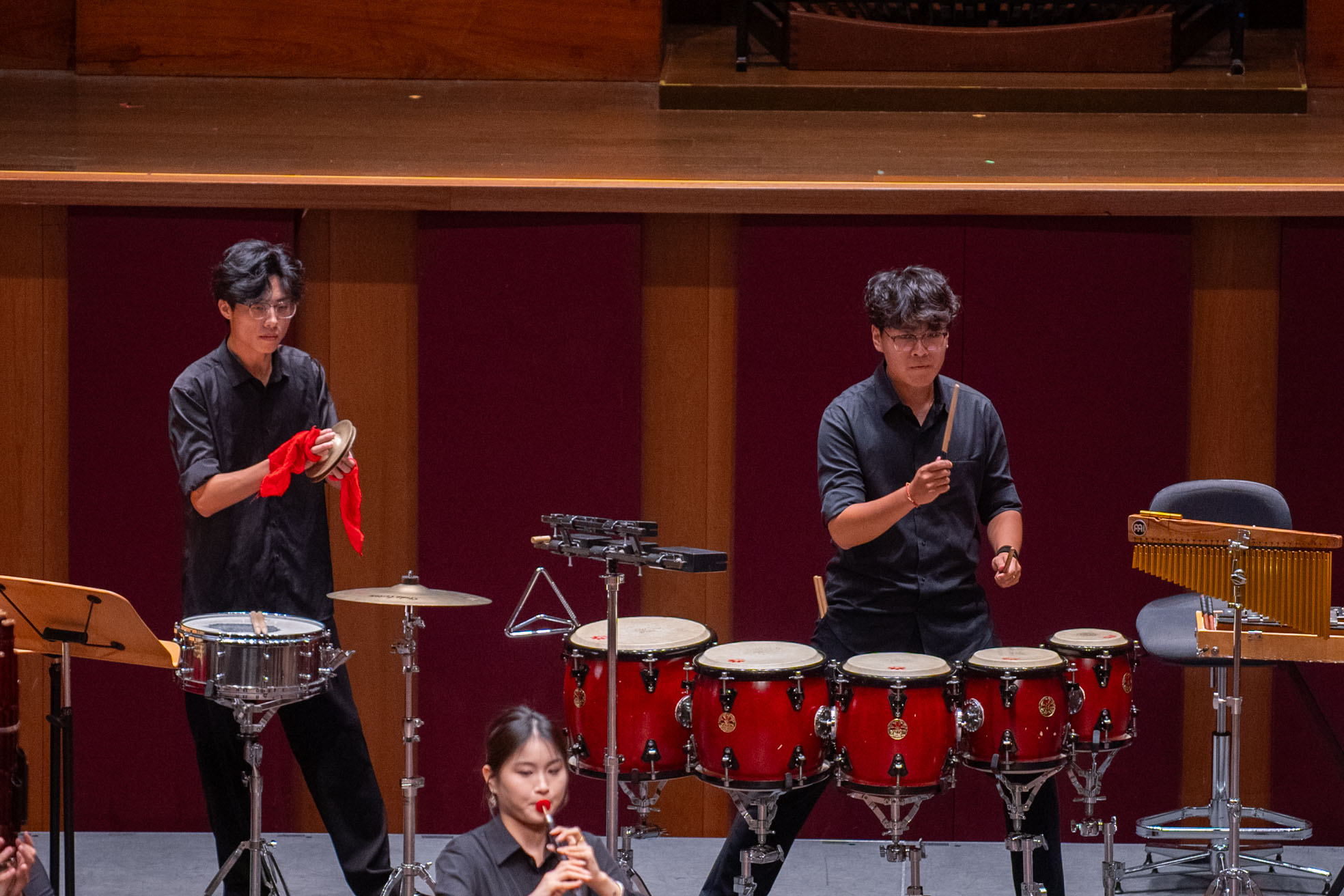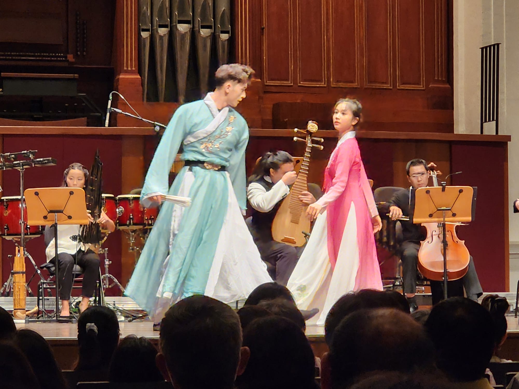 整场音乐会紧扣“鲁韵新声”主题,曲目编排精致多元,融合传统与现代、中国与南洋的艺术元素。演出曲目包括新加坡作曲家王辰威的《笛缘》,由山东大学艺术学院研究生江卓然与新加坡青年演奏家余安之共同演绎双笛合奏;中国音乐家李博禅创作的协奏曲《楚颂》,由山东大学的邵佳雯与新加坡青年演奏家林明正合作呈现双胡琴协奏,琴韵交织,奏出楚风汉韵的深情旋律;新加坡青年演奏家李芷昕则带来中阮独奏《山歌》,以细腻音色演绎朴实动人的民间旋律。原创舞蹈《琴棋书画》由鼟乐团创作,联合山东大学学生与新加坡华族舞蹈剧场舞者共同演出,首次亮相舞台,为观众带来耳目一新的艺术体验。