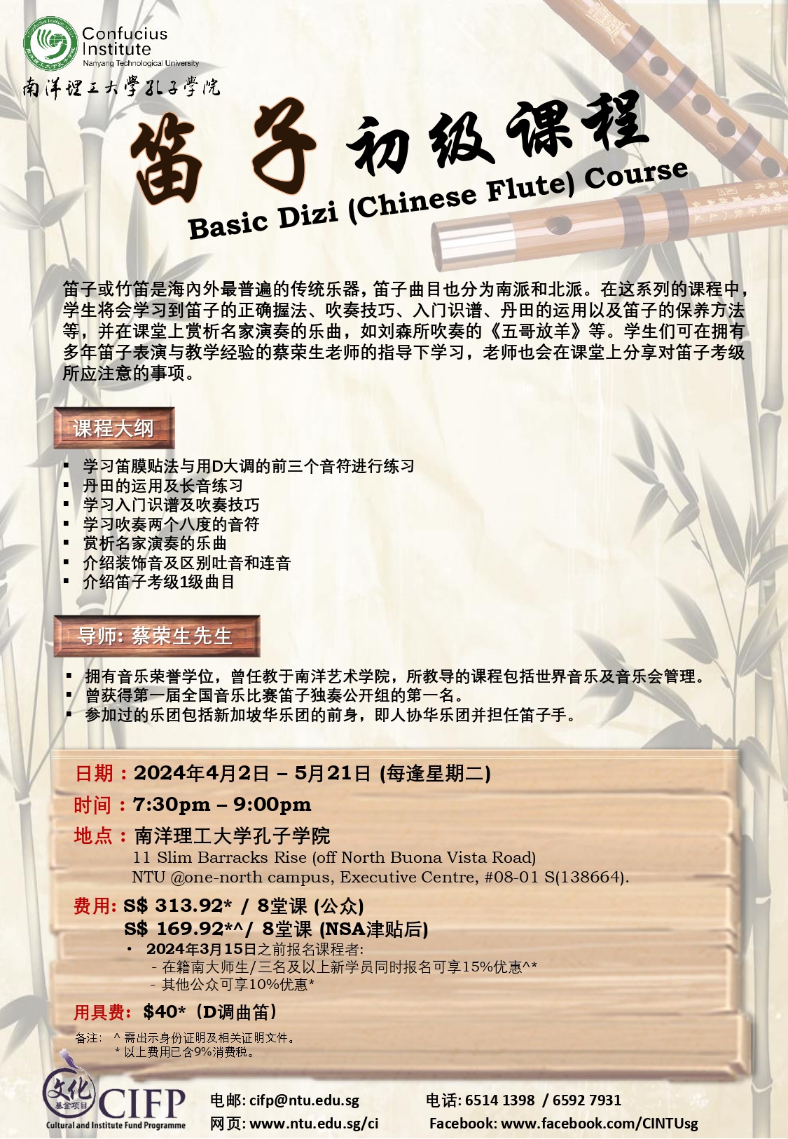 学生将学习到笛子的正确握法、吹奏技巧、入门识谱、丹田的运用以及笛子的保养方法等,并在课堂上赏析名家演奏的乐曲。学生们可在拥有多年笛子表演与教学经验的蔡荣生老师的指导下学习,蔡老师也会在课堂上分享对笛子考级所应注意的事项。