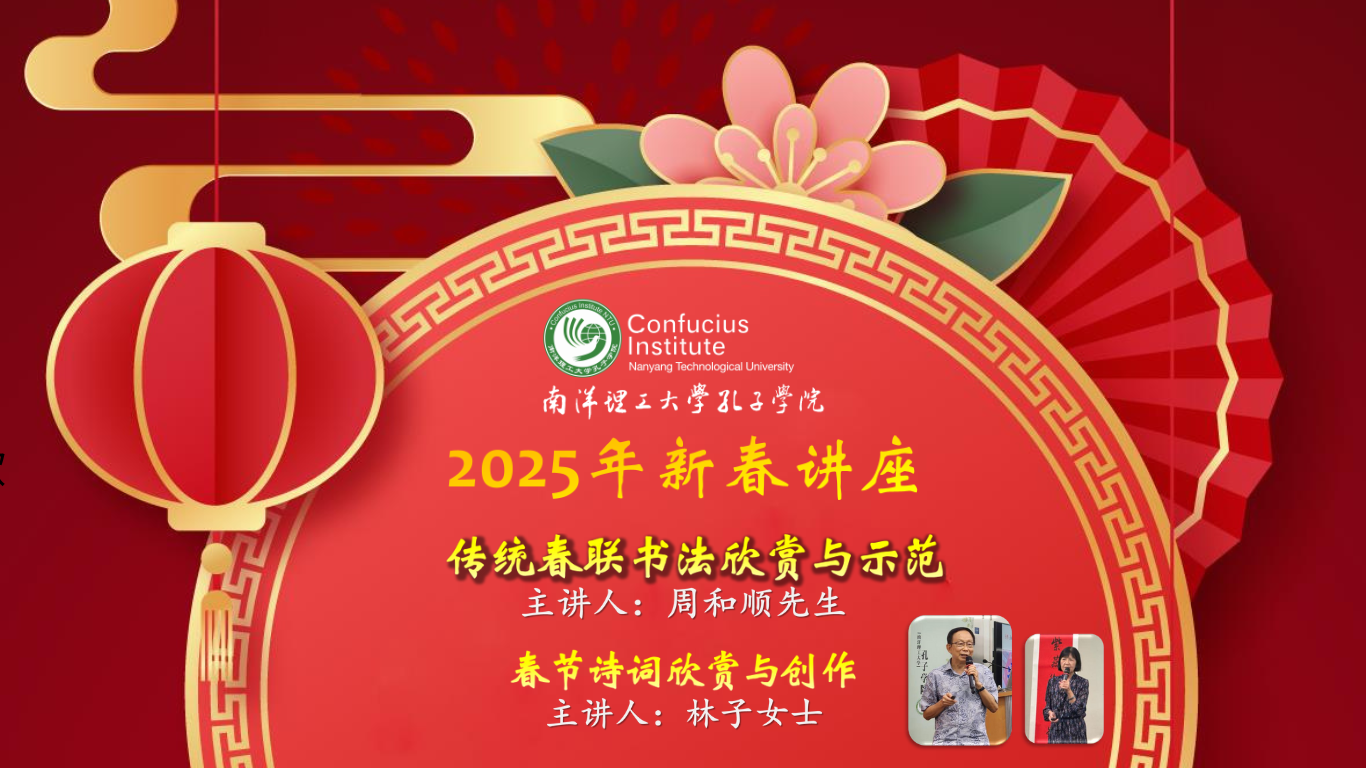 南洋理工大学孔子学院将于2025年1月19日(星期日)举办一场由周和顺先生主讲的 “传统春联书法欣赏与示范” 讲座。同时,林子女士也将在现场以 “春节诗词欣赏与创作” 为主题进行分享。