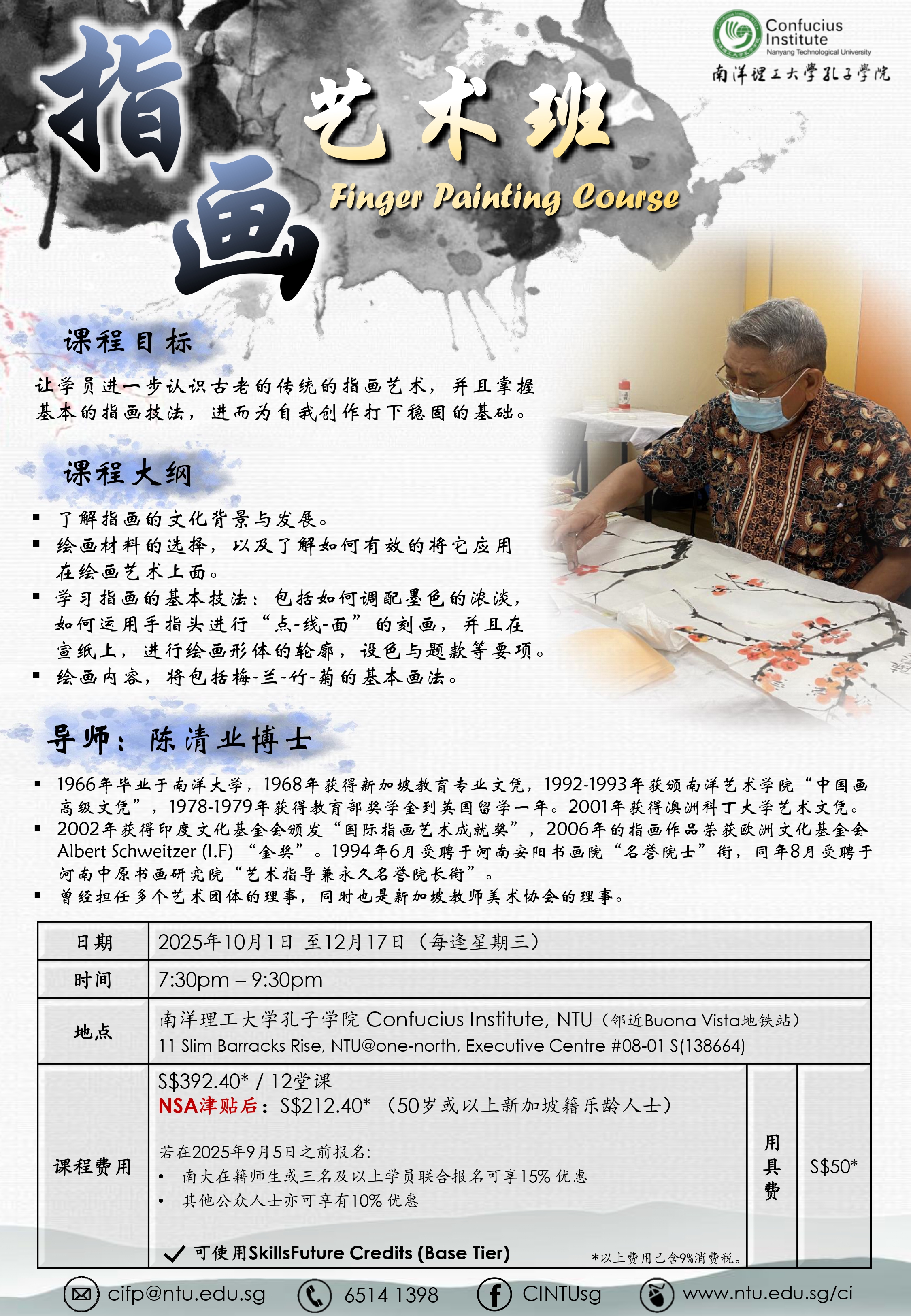 指画艺术班:如何运用手指头进行 “点- 线- 面” 的刻画,并且在宣纸上,进行绘画形体的轮廓,设色与题款等。