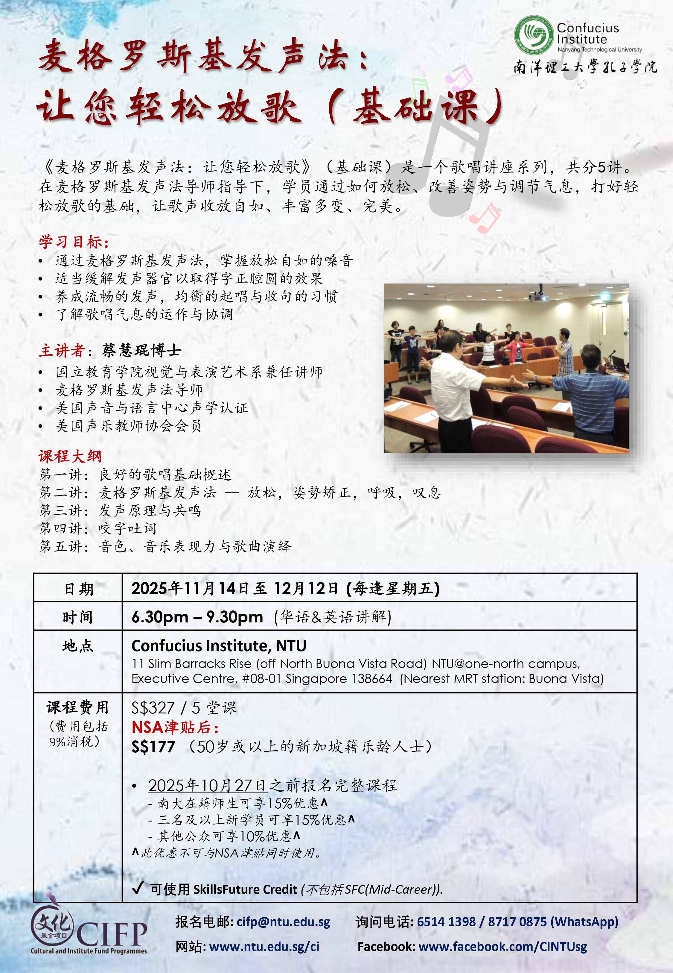 《麦格罗斯基发声法:让您轻松放歌 》是一个歌唱讲座系列,共分 5 讲 。在经验丰富的麦格罗斯基发声法专业老师指导下,学员通过如何放松 、改善姿势与调节气息,演练收放自如 、丰富多变 、音色完美的歌声,以了解轻松放歌的真谛 。