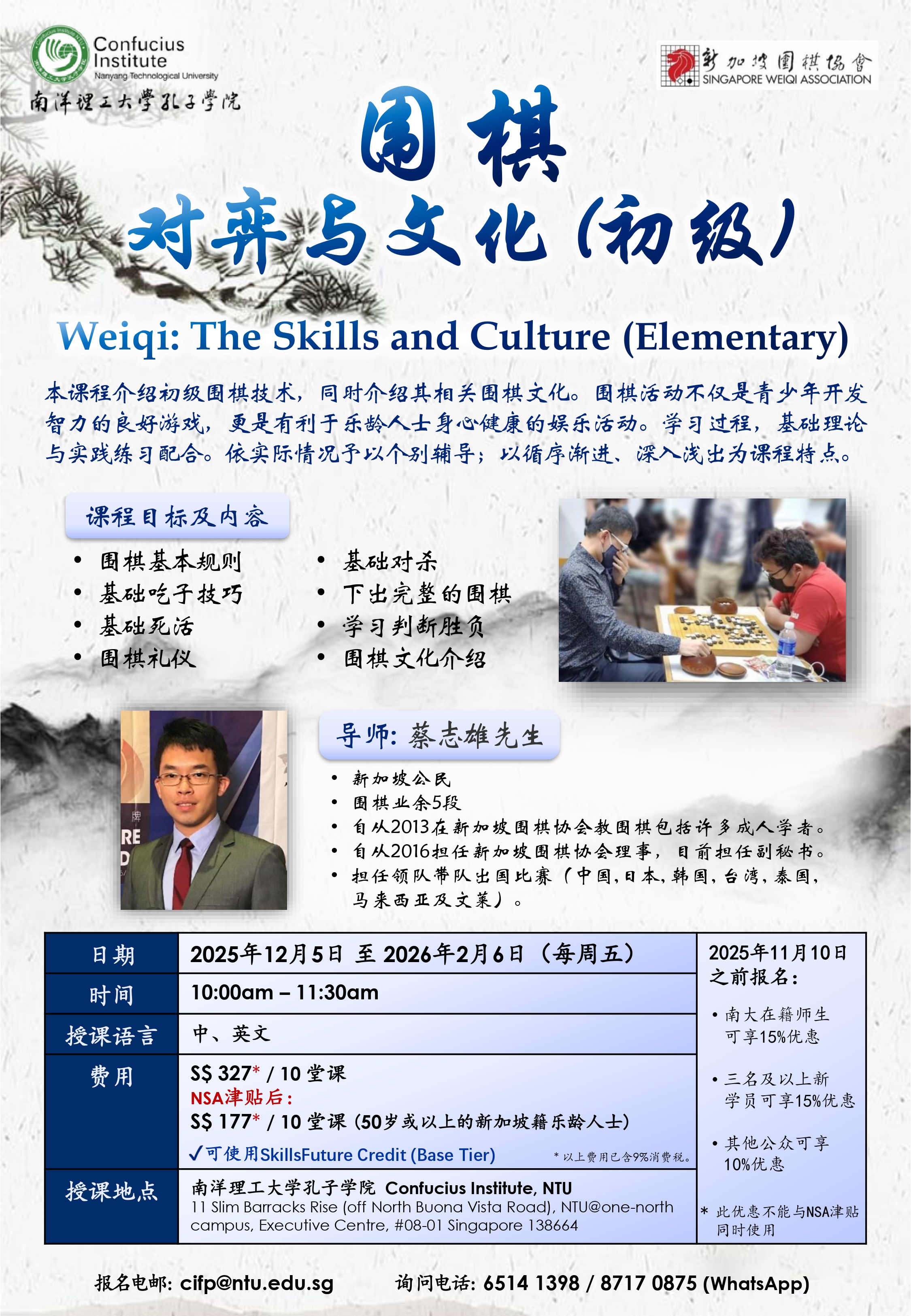 本课程将由资深围棋导师蔡志雄先生(Mr Chuah Chee Hiong)亲自授课,带领学员从零基础出发,系统学习围棋规则、基本技巧与实战演练,并深入了解围棋所蕴含的文化内涵。