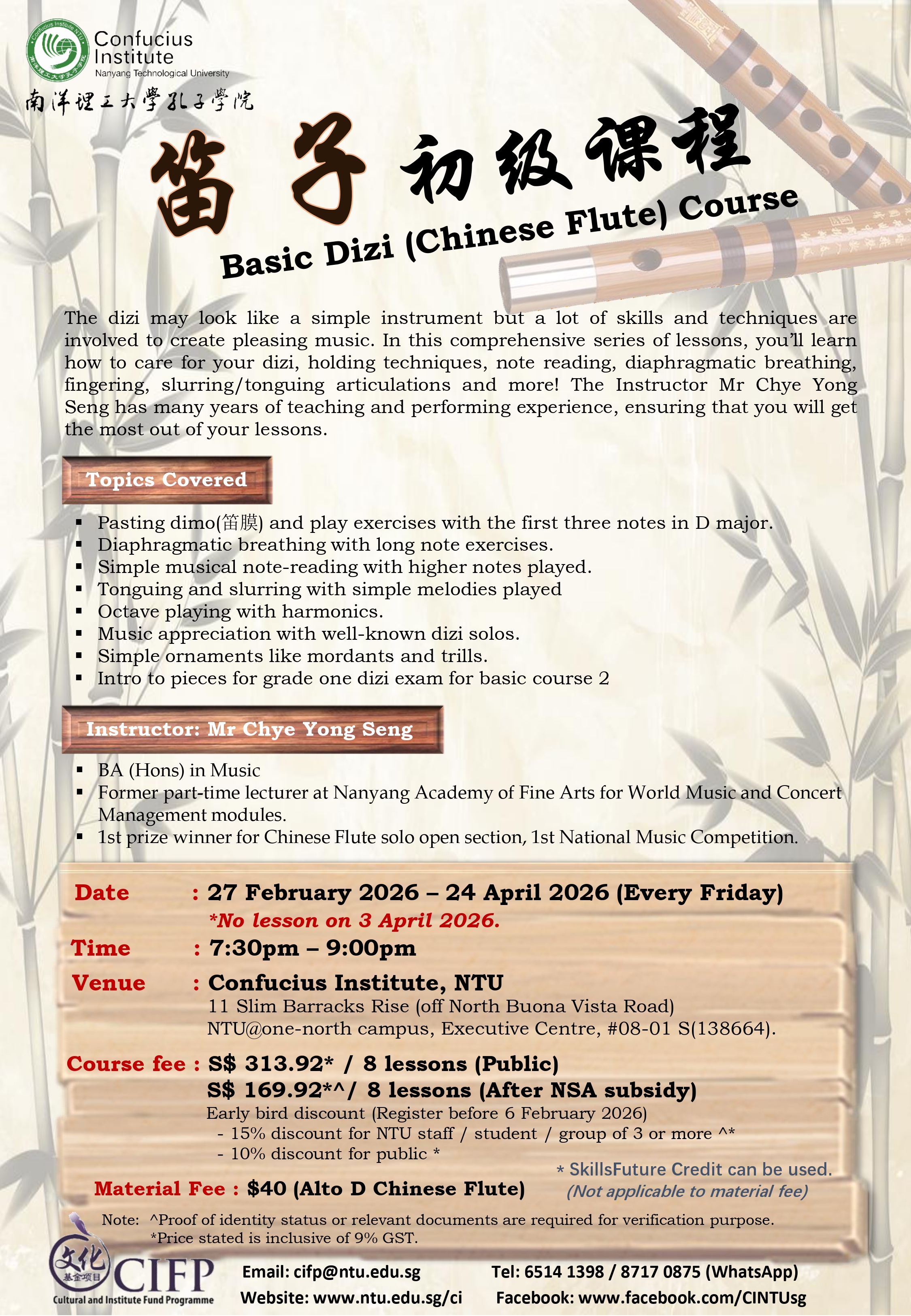 学生将学习笛子的正确握法、吹奏技巧、入门识谱、丹田的运用以及笛子的保养方法等,并在课堂上赏析名家演奏的乐曲。学生们可在拥有多年笛子表演与教学经验的蔡荣生老师的指导下学习。