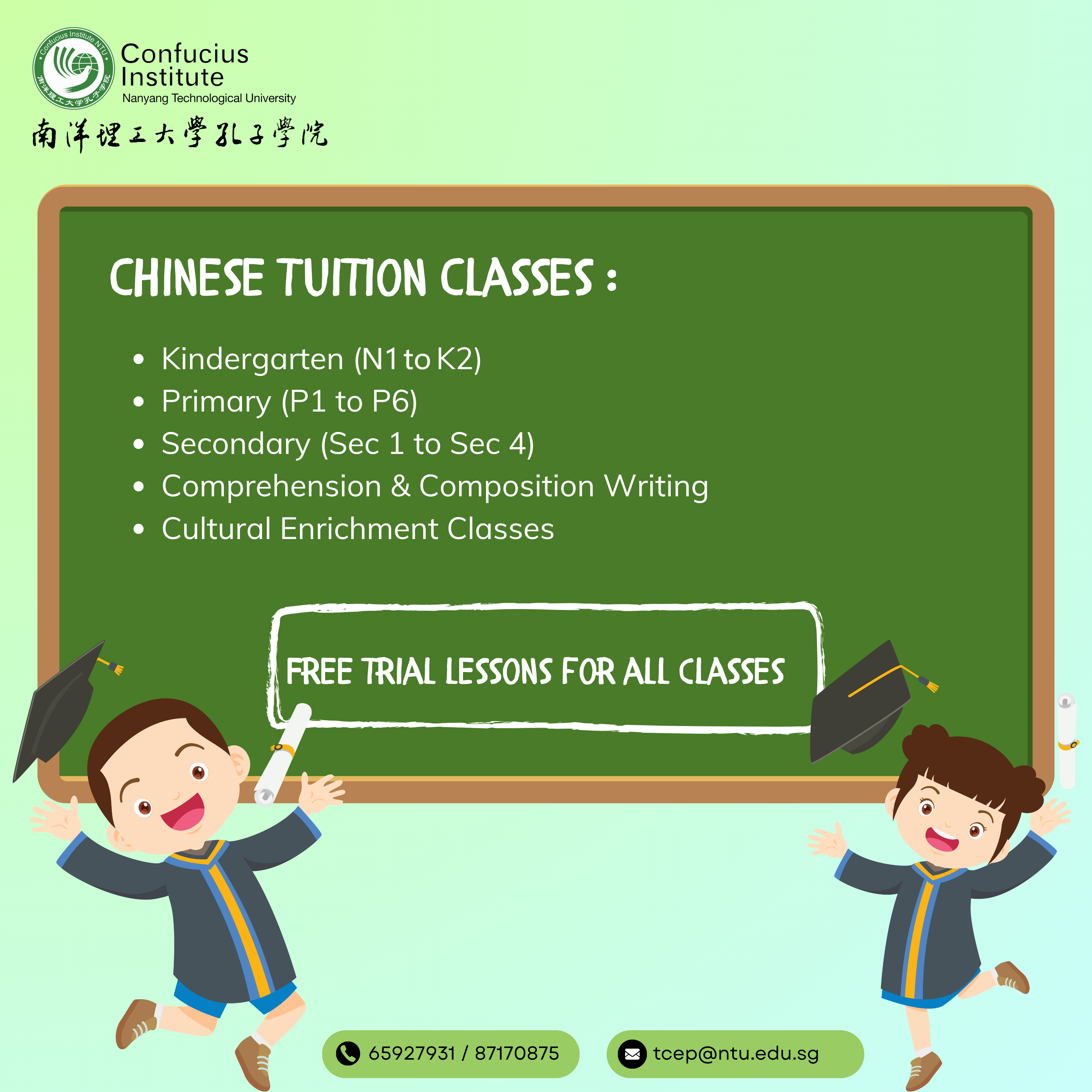 学生华文课程 Chinese Language Programmes for Students For Registration and Enquiries, please contact us:Contact No.: 6592 7931 / WhatsApp: 8717 0875 Email: [email protected]