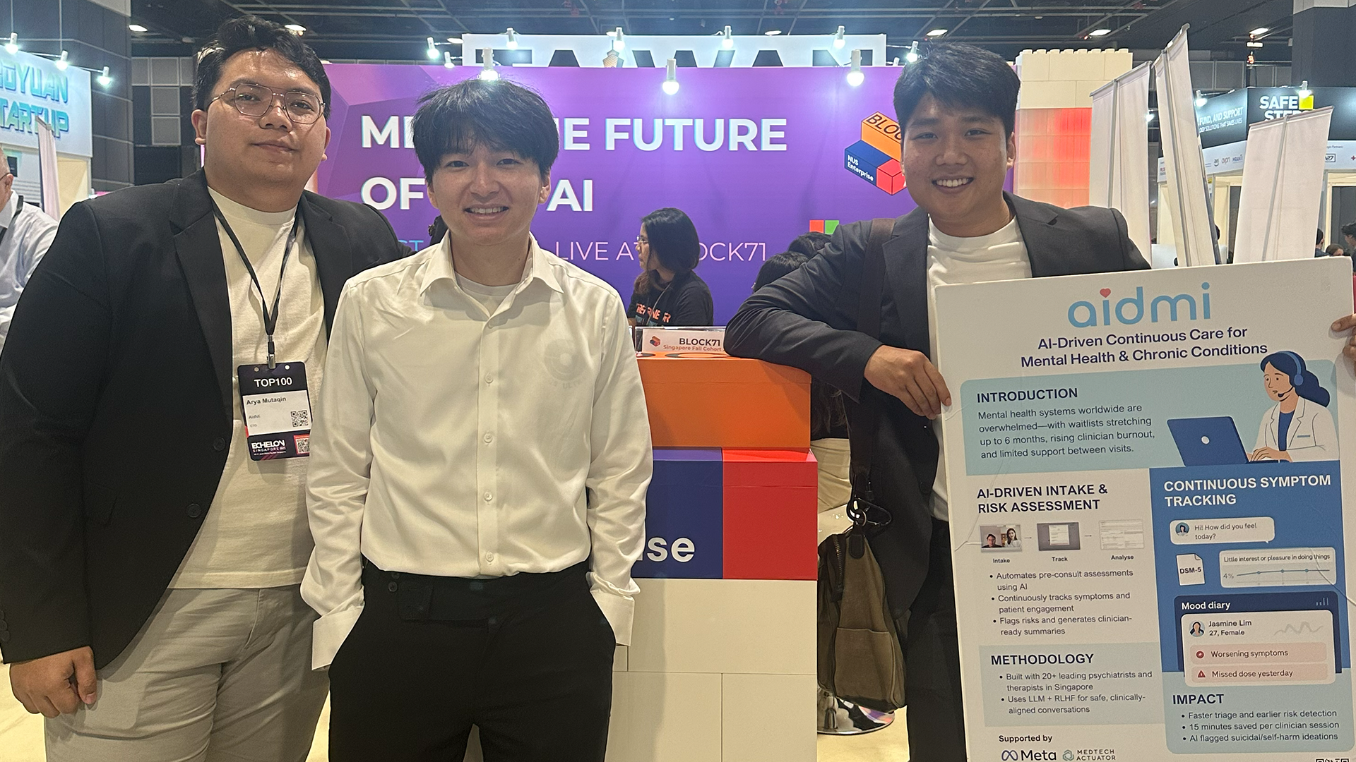 The story of AidMi began when NTU students Alen Tao (NBS), Wang Yu Teng (CCDS), and Shanice Lim (CEE) first came together with a vision to address gaps in mental health care. Alen focused on partnerships, Yu Teng on product development, and Shanice on product design. Their shared goal was to reduce long wait times, high costs, and fragmented workflows in clinical settings by leveraging technology.