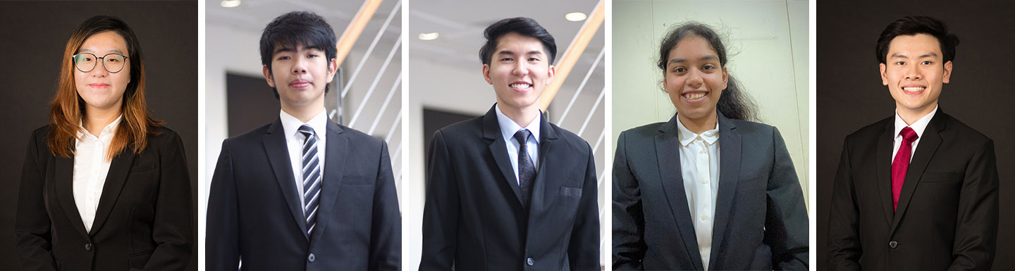 From left: Alice Chua Qin Hui (DSAI, Year 3), Honorary General Secretary; Chua Boon Han (CS, Year 3), Vice President ; Hoo Kah Jun (CS, Year 2), President; Puvvada Meghana (CS, Year 2), Vice President ; Ernest Tan Yan Heng (BCG, Year 2), Honarary Financial Controller.