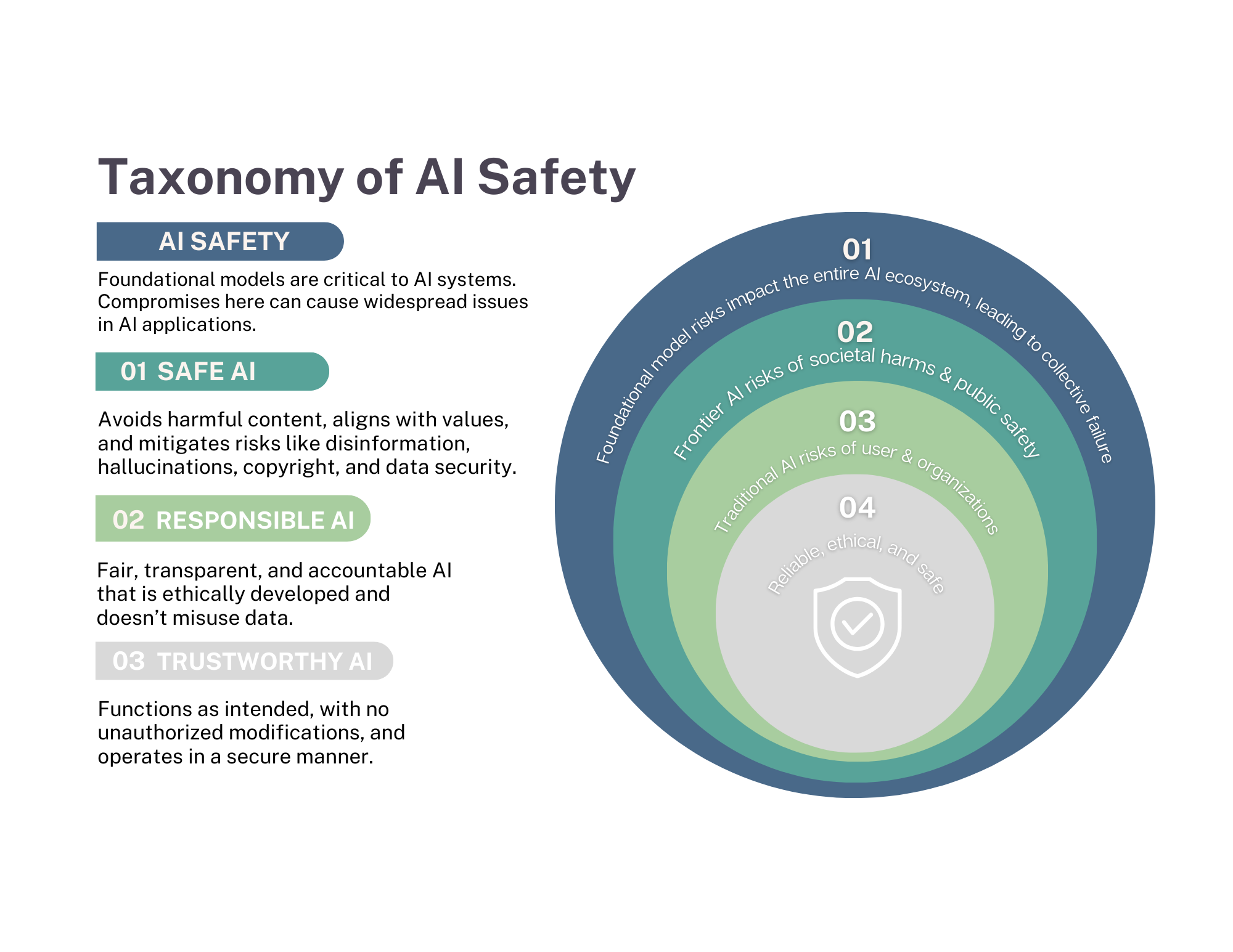 AI safety focuses on identifying and addressing risks in AI models to ensure they function as intended and meet specifications. Our AI Safety Framework highlights trustworthiness, responsibility, and collaboration to mitigate risks across all stages of AI development.