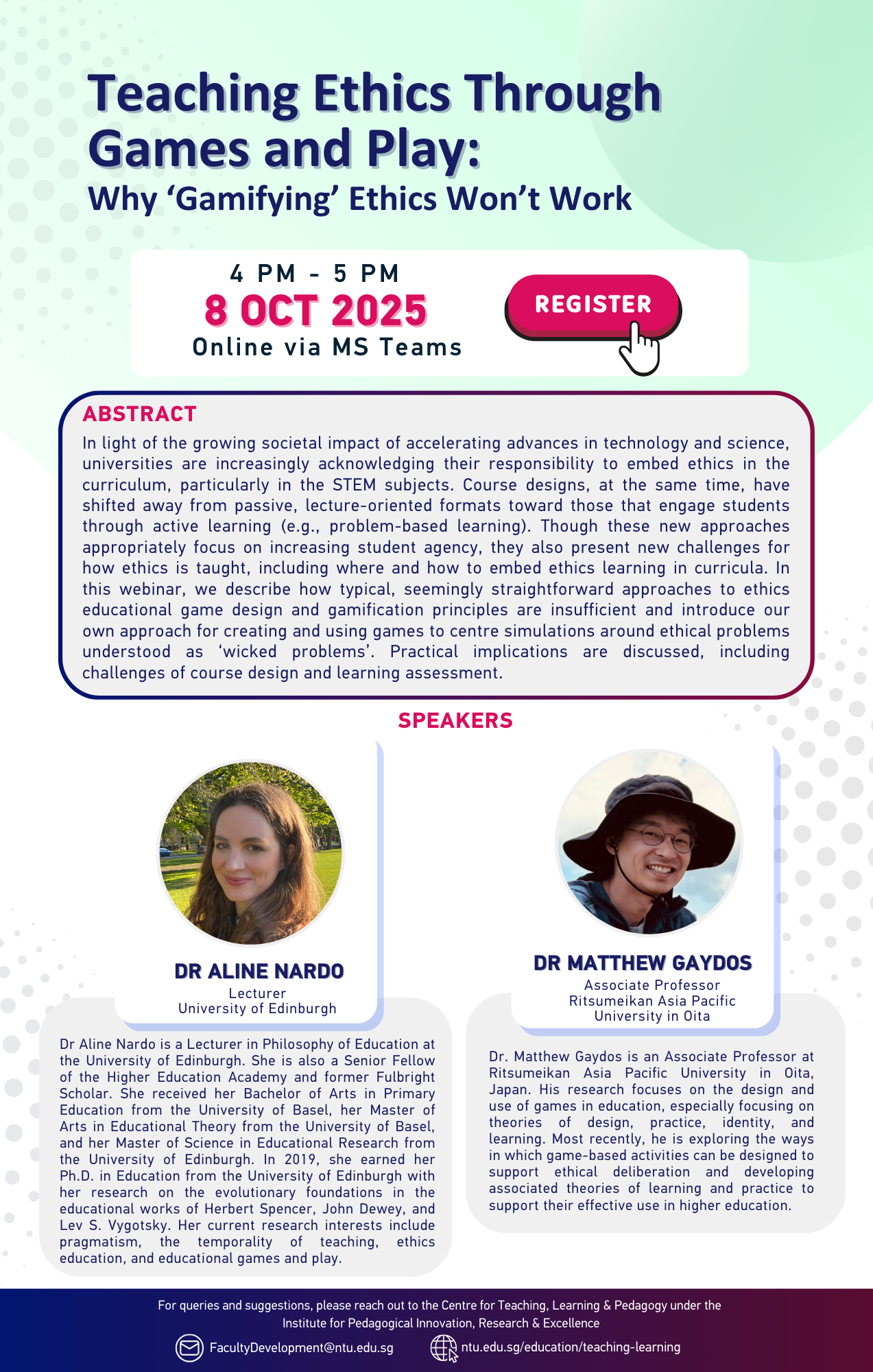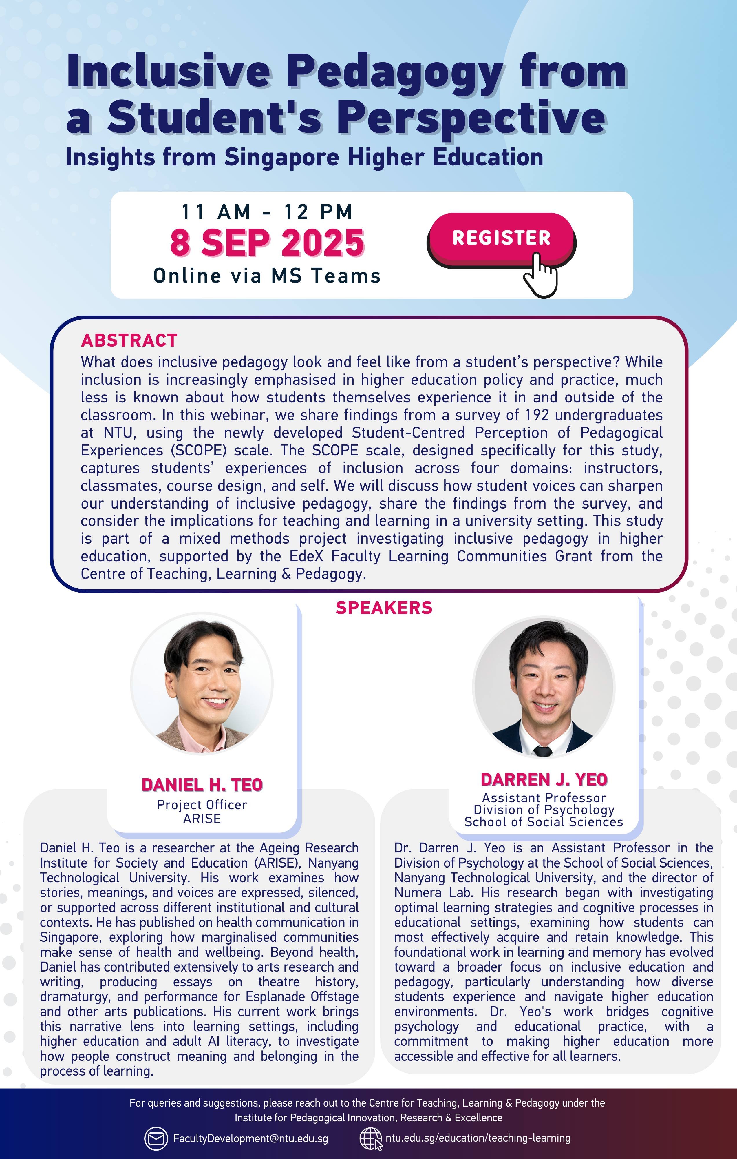 8 September (Mon) 11am-12pm - Inclusive Pedagogy from a Student's Perspective: Insights from Singapore Higher Education