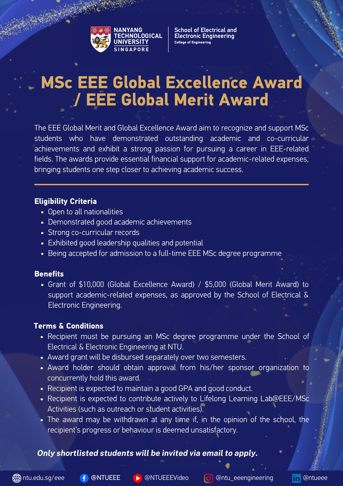 Each recipient will receive a cash grant of S$10,000 (Global Excellence Award) / $5,000 (Global Merit Award) to help cover academic related expenses, subject to approval by the School of Electrical & Electronic Engineering.