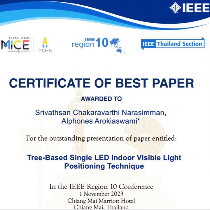 Assoc Prof Arokiaswami Alphones won the Best Paper Award at the IEEETENCON 2023 held in Chiangmai, Thailand in November. He authored the paper entitled "Tree-Based Single LED Indoor Visible Light Positioning Technique" together with EEE graduate student Srivathsan Chakaravarthi Narasimman.