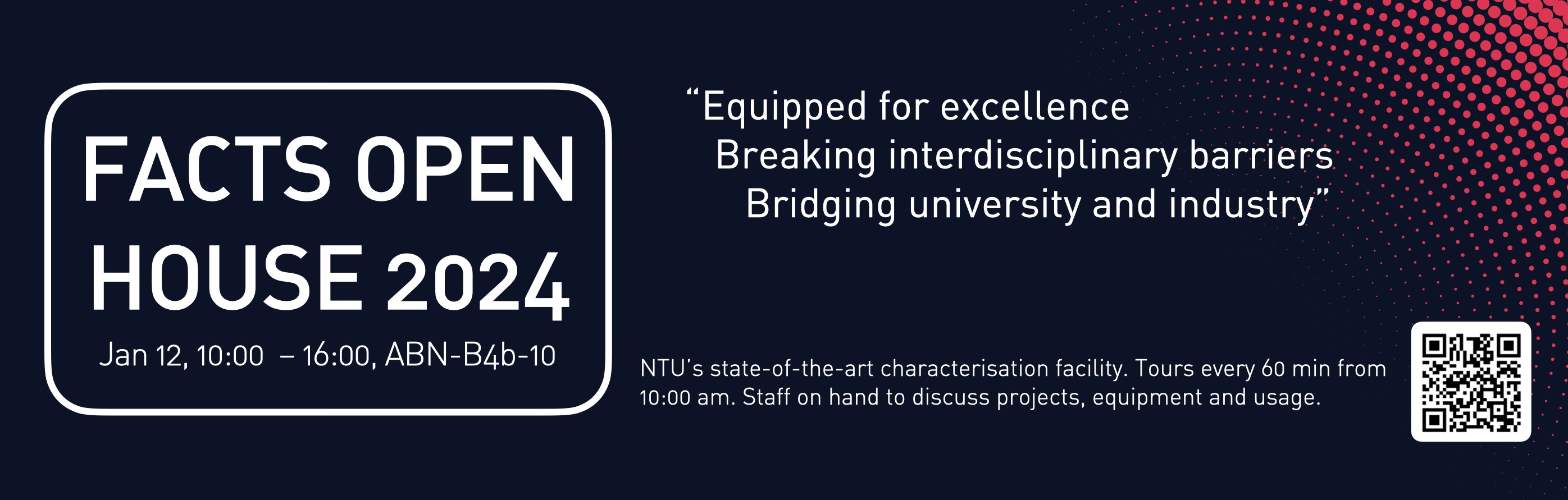 NTU FACTS cordially invites you to our Open House on 2 Sep 2025 (Tue), 10am to 4pm! Come down to have a look at our Electron Microscopy, X-ray Diffraction and Surface Analysis instruments and chat with our scientists about how our equipment can help your experiments and work.