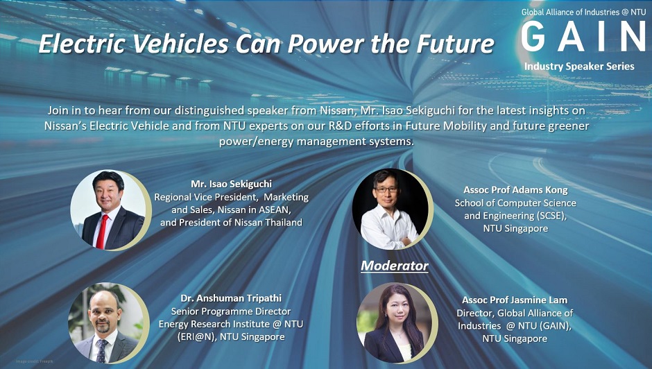 On February 17th, 2023, the Global Alliance of Industries @ NTU (GAIN) organised an Industry Speaker Series on the topic of "Electric Vehicles Can Power the Future". The event featured esteemed guest speakers Mr Isao Sekiguchi, Dr Anshuman Tripathi (Senior Programme Director, Energy Research Institute @ NTU), and Assoc Prof Adams Kong (School of Computer Science and Engineering, NTU).