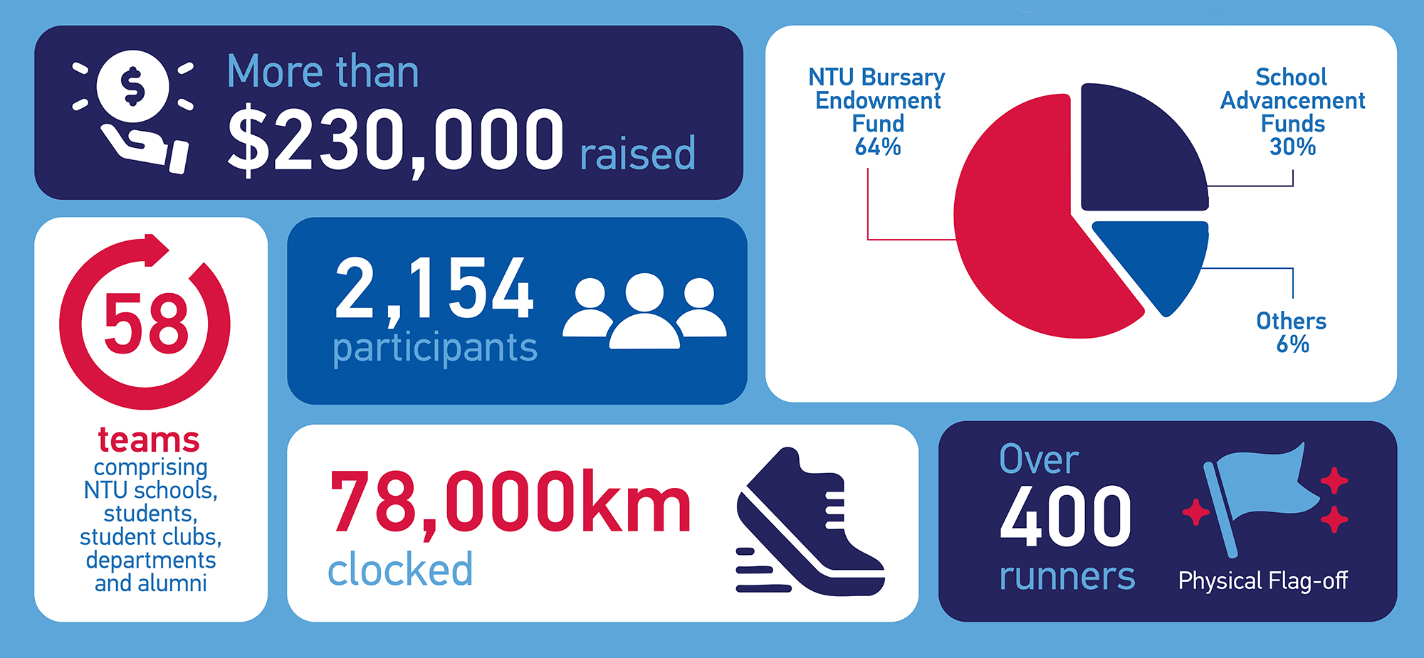 As part of the inaugural We Belong campaign, Best Foot Forward fundraising virtual run was held from 18 February to 31 March 2022. Over 1,000 participants clocked close to 38,000 kilometres by running or walking, and raised close to S$200,000 for the NTU Bursary Fund, School Advancement Funds and NTU Priorities Fund.