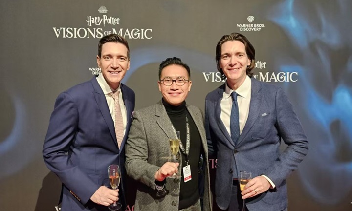 Darren Lim (centre) with James and Oliver Phelps who played the Weasley twins in the Harry Potter film series, at the opening for the Harry Potter: Visions of Magic interactive art experience at the ODYSSEUM in Cologne, Germany in 2023.